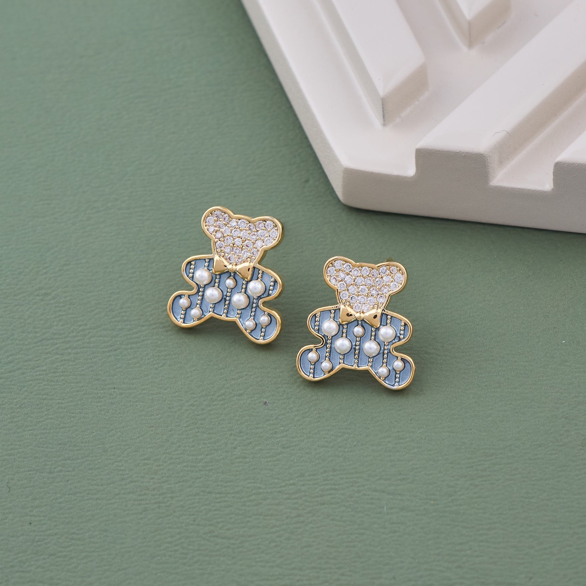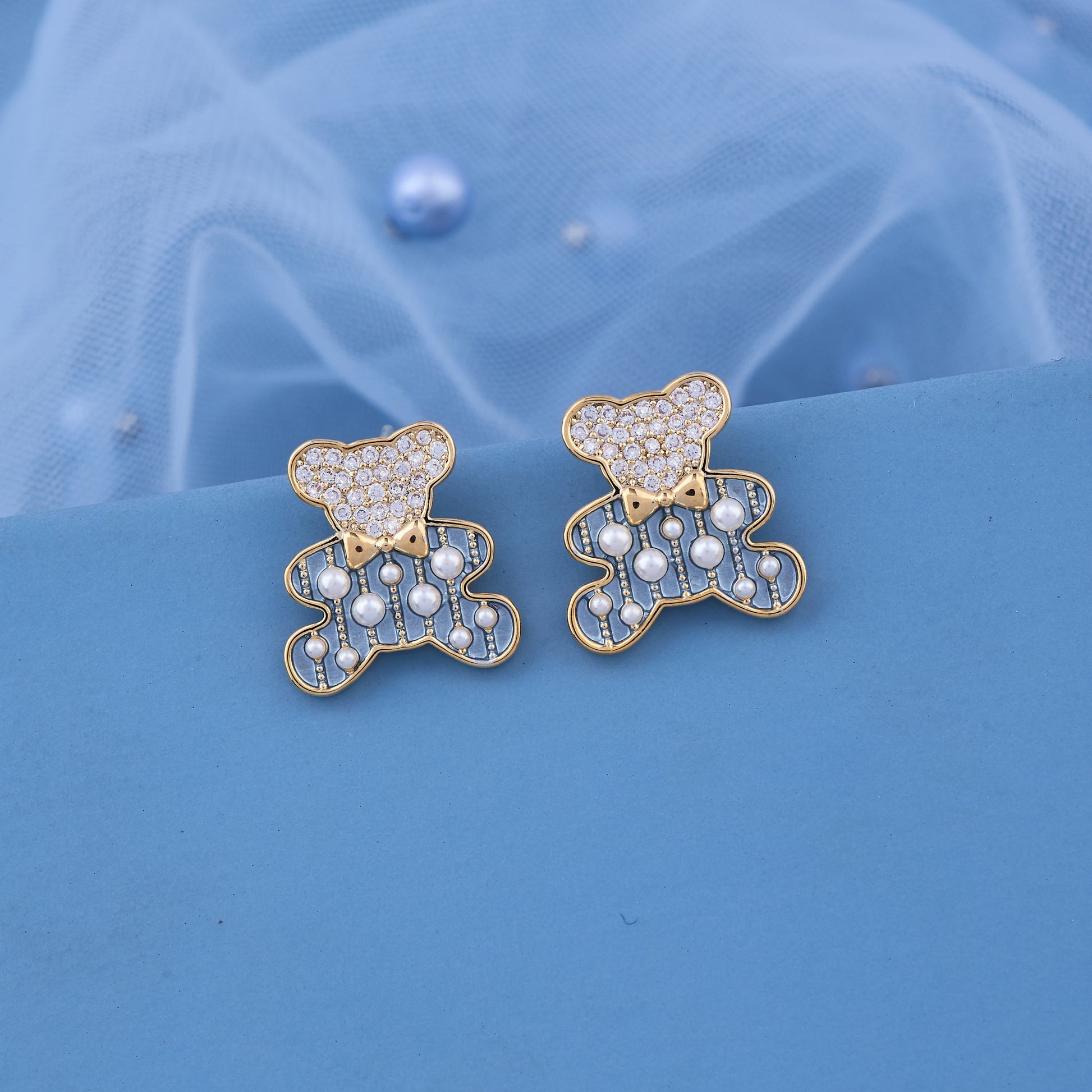 The Earrings features a pair of gold earrings with a unique bear-shaped design, beautifully adorned with pearls. These fashionable accessories combine elegance with playful charm, making them a standout addition to any jewelry collection. Their shimmering appearance enhances their appeal as a trendy, bling-bling statement piece.