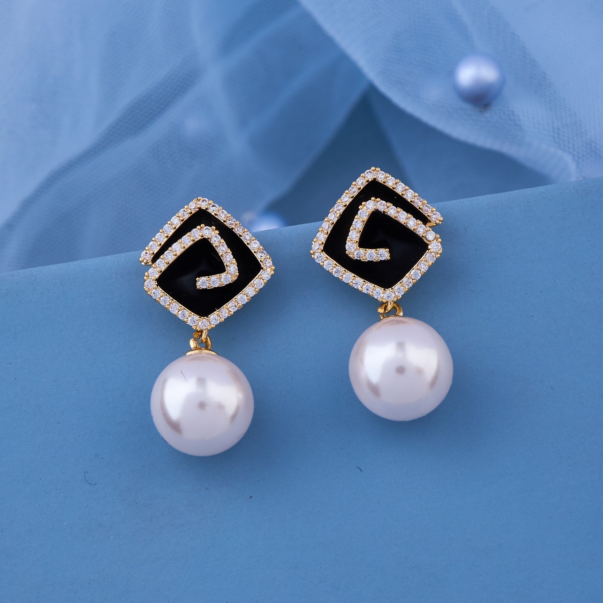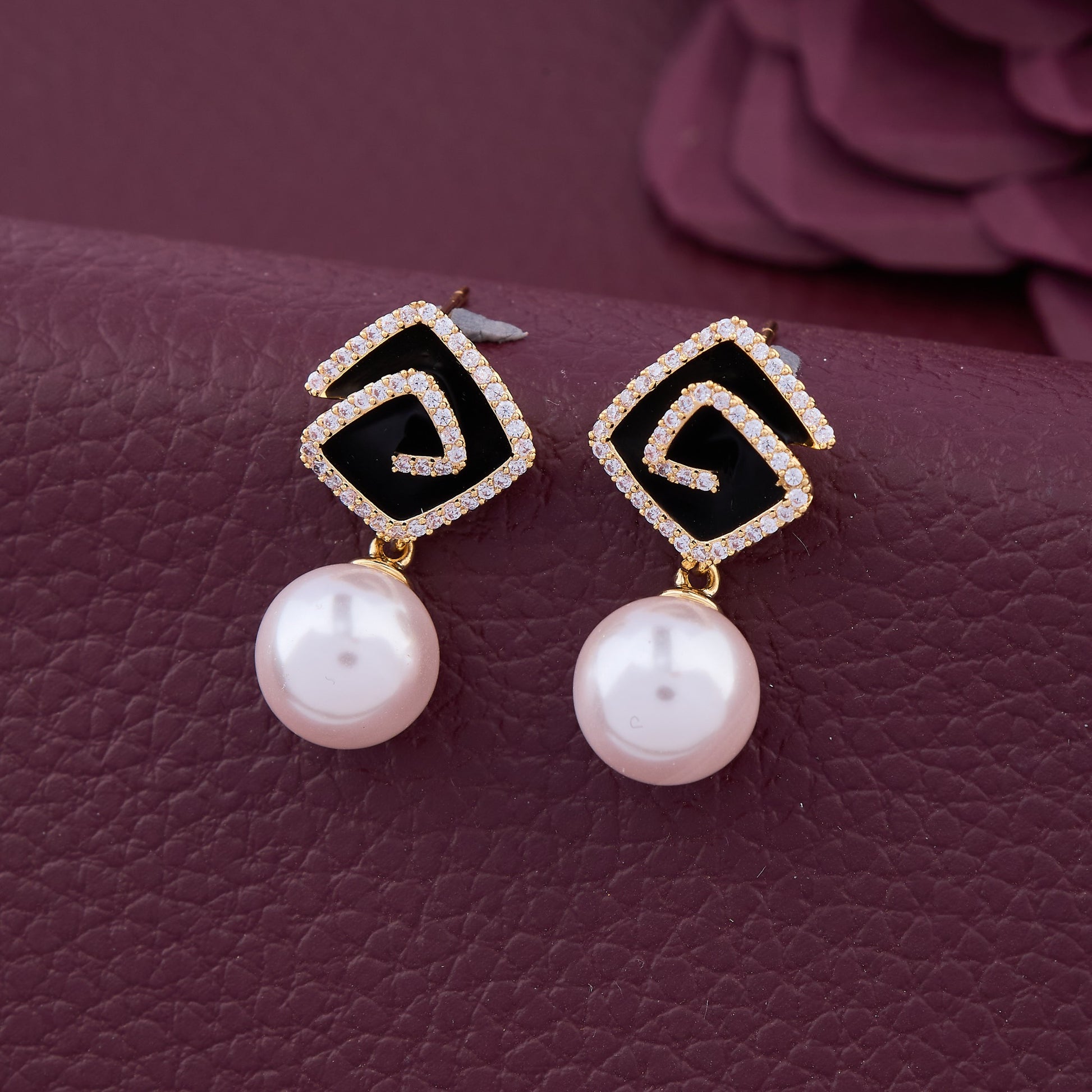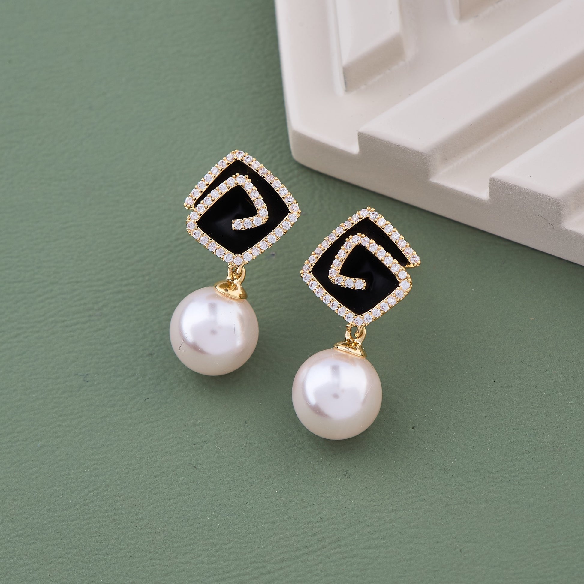 A pair of elegant earrings featuring black geometric tops outlined with sparkling stones, complemented by large, lustrous pearl drops. The design combines modern shapes with classic materials, making them a stylish and versatile fashion accessory.