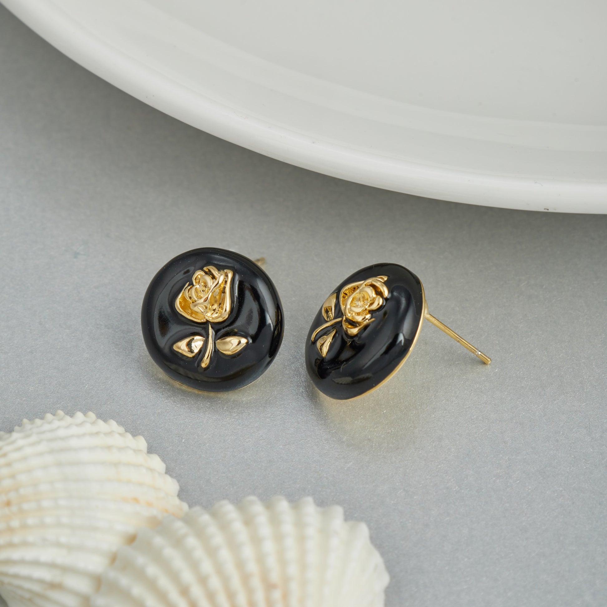 This pair of black earrings is beautifully adorned with intricate gold flower motifs, creating a stunning contrast between the deep black base and the elegant gold detailing. A bold and sophisticated fashion accessory, perfect for making a statement.