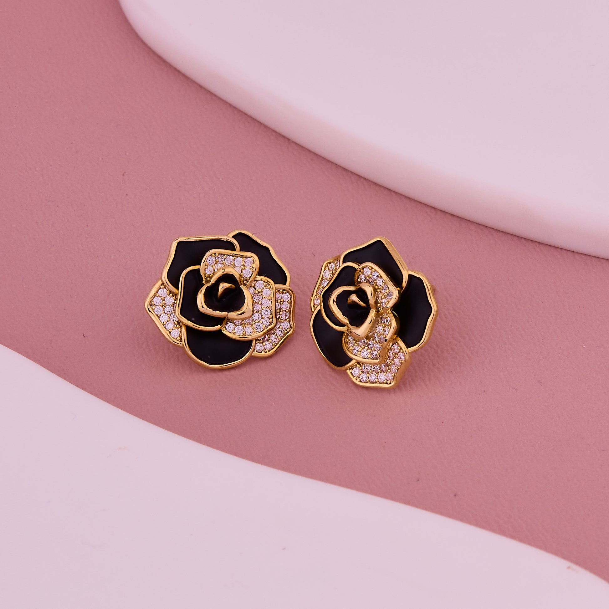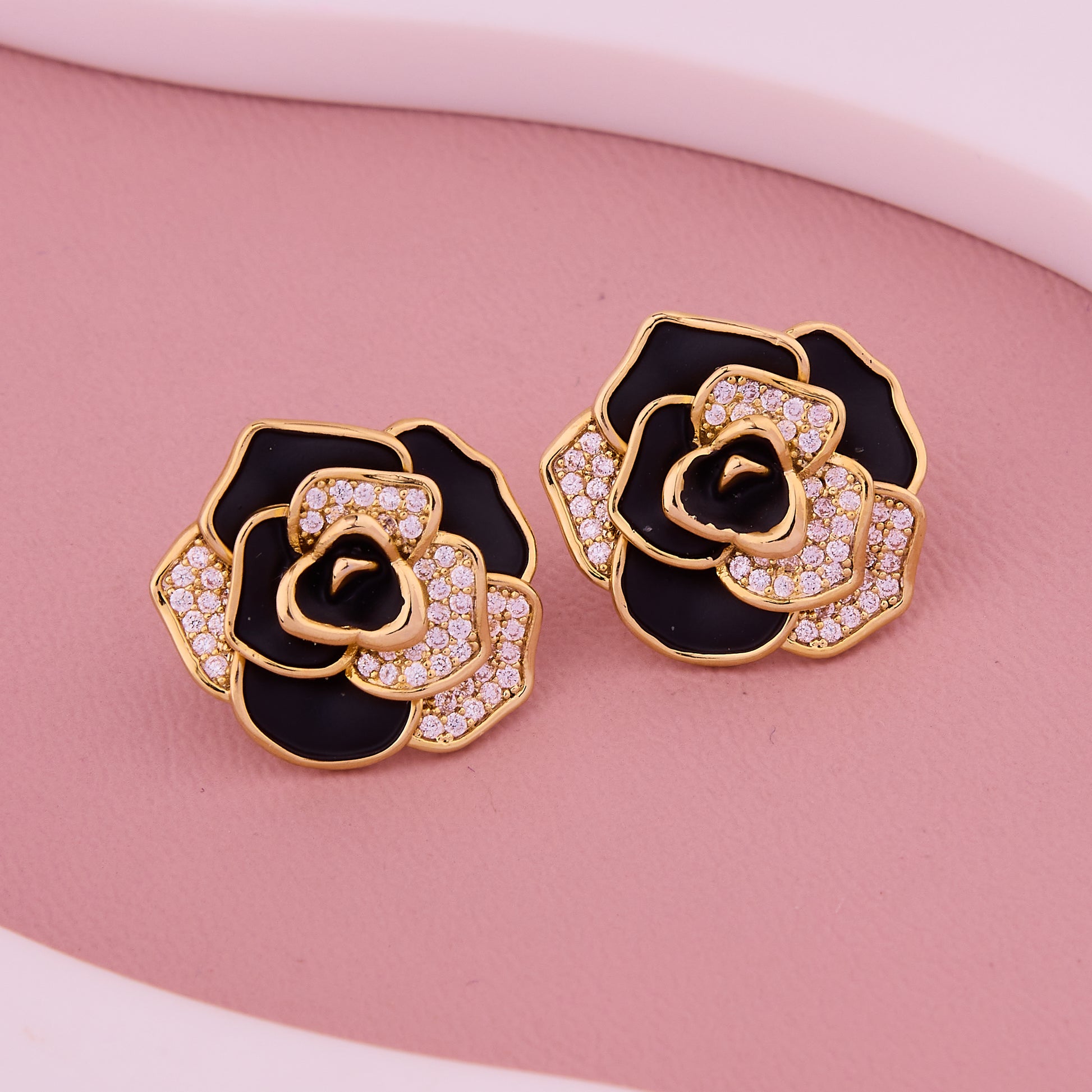 Black & Gold Rose Crystal Petal Stud Earrings