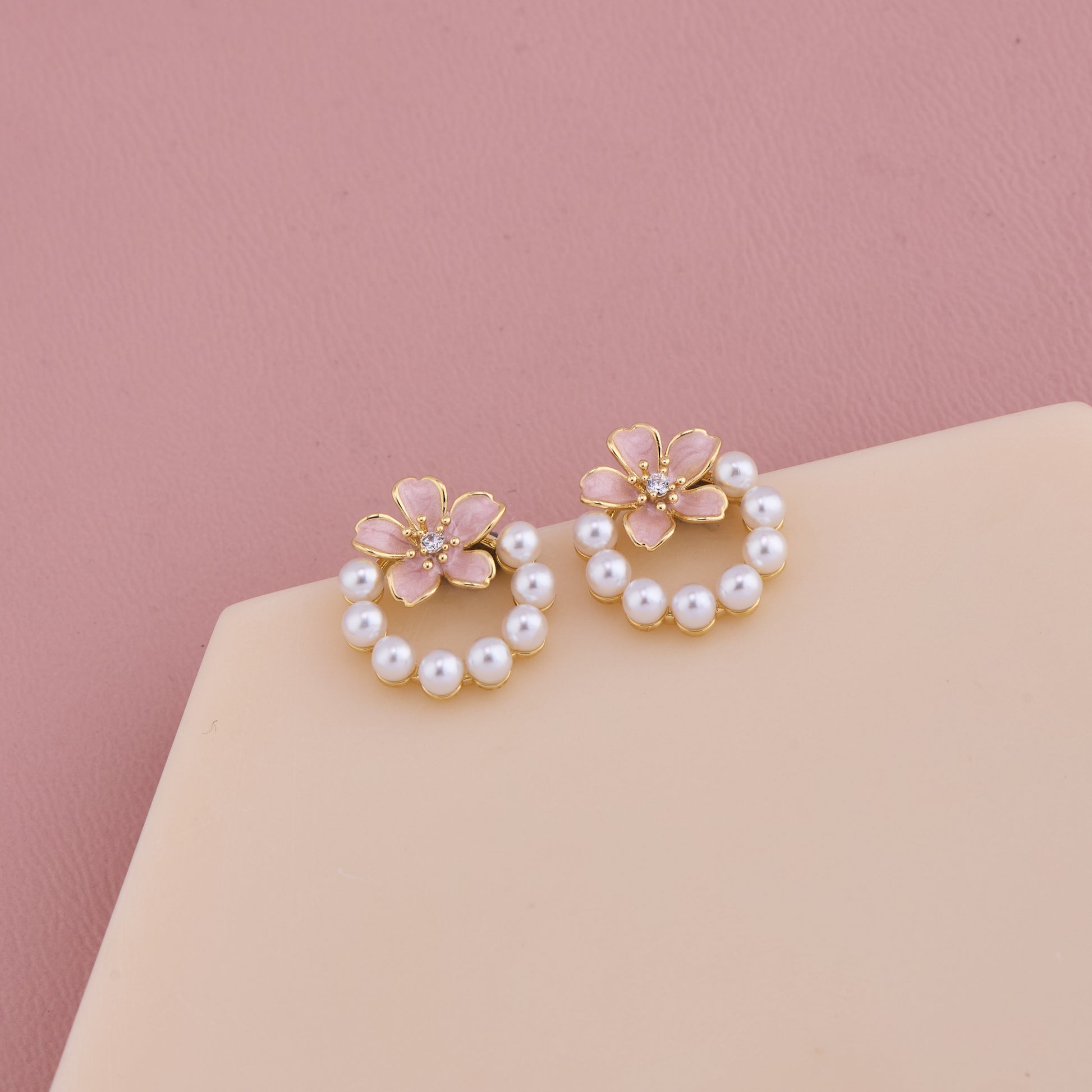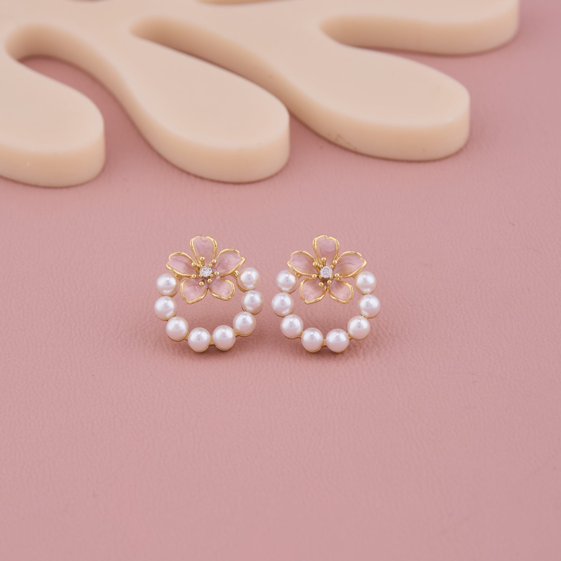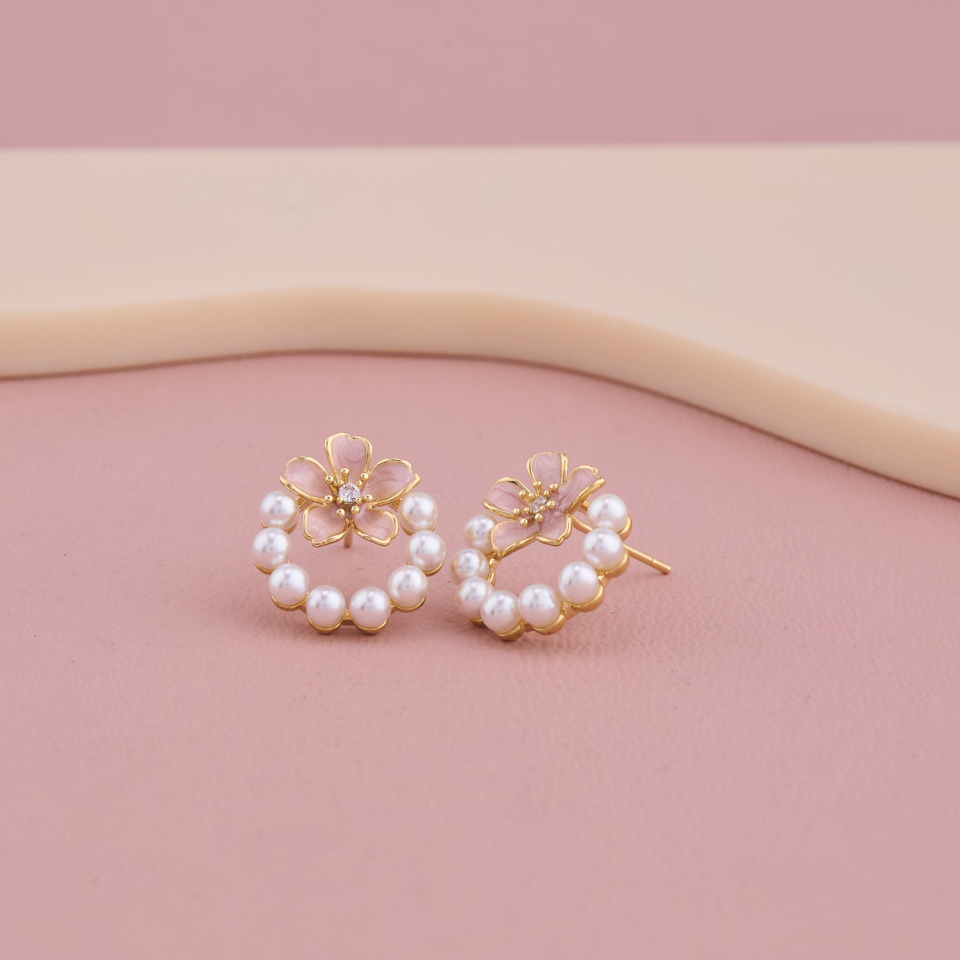 Blossom Pearl Hoop Earrings with Pink Floral Accent