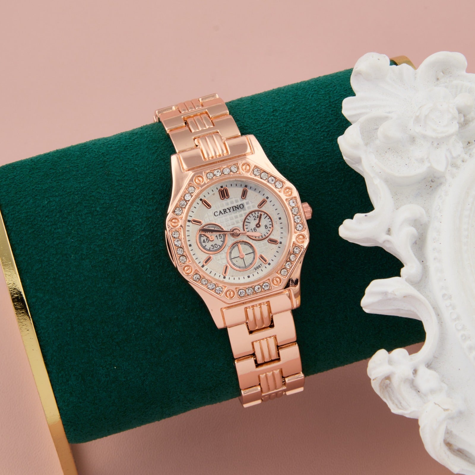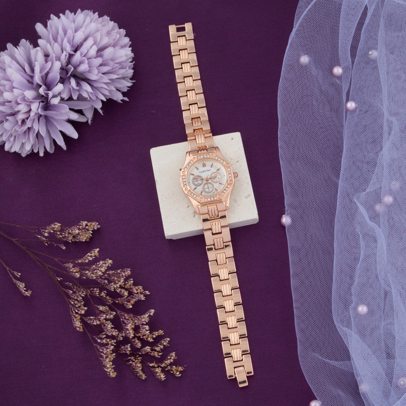 Bold Chronograph Rose Gold Watch with white Dial & Crystal Bezel for Women