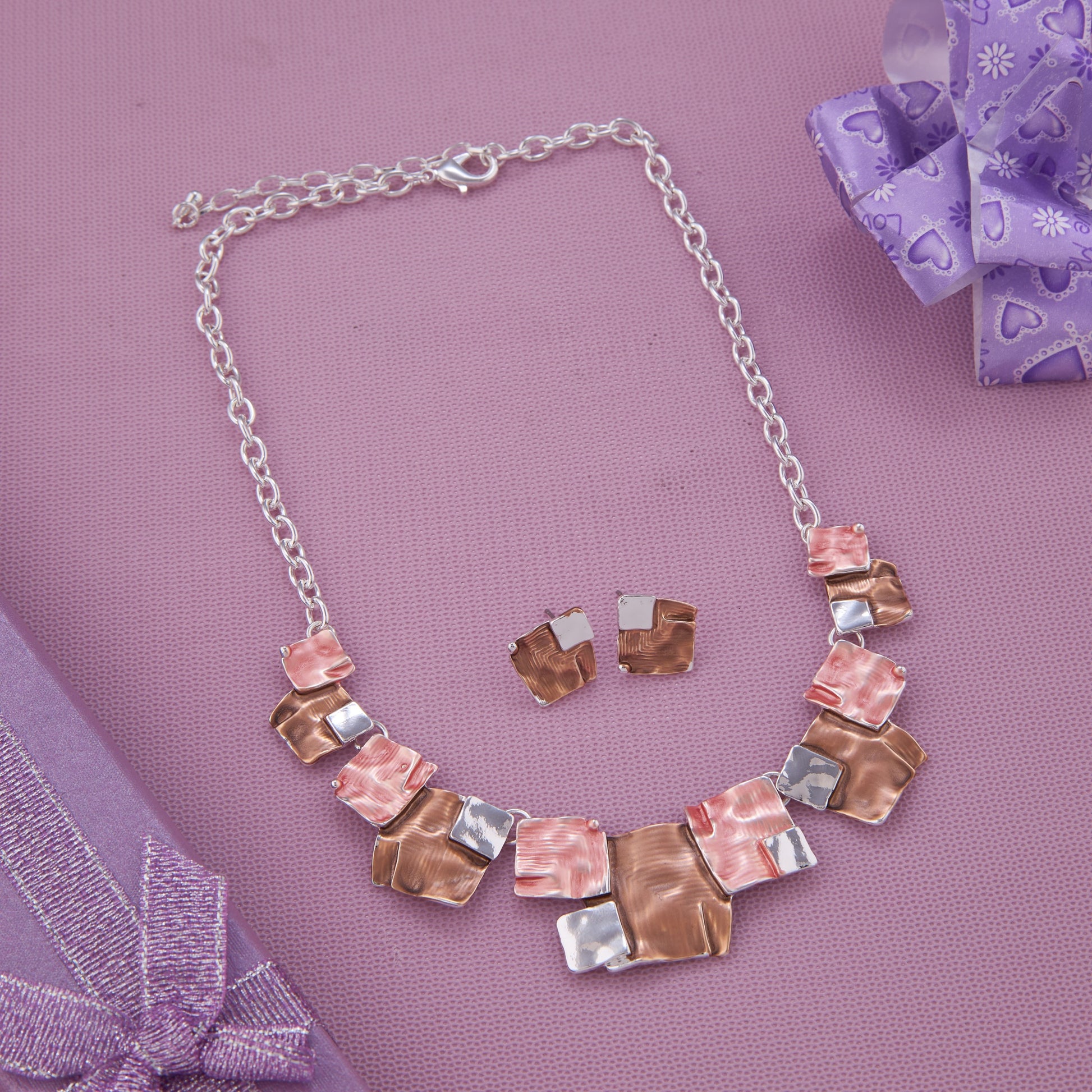 This stunning jewelry set features a silver-tone chain necklace paired with matching earrings, designed with a contemporary mosaic of brown, pink, and metallic squares. The unique combination of warm and cool tones adds sophistication and style to any outfit. Perfect for formal events, parties, or everyday chic looks.