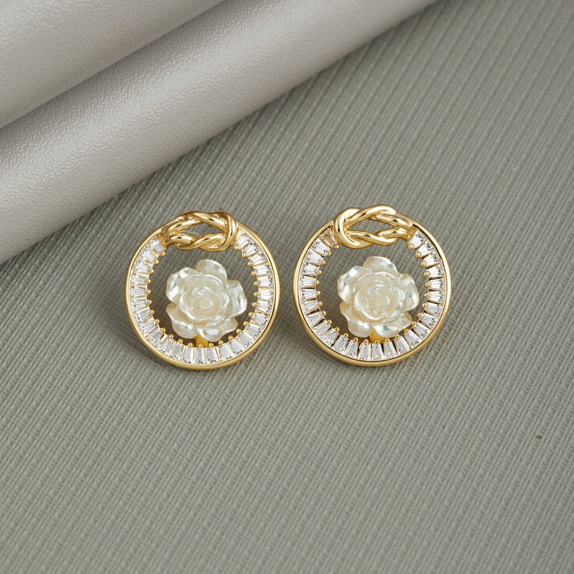 Chic Gold-Tone Round Earrings with Crystal Rose Center for Women & Girls