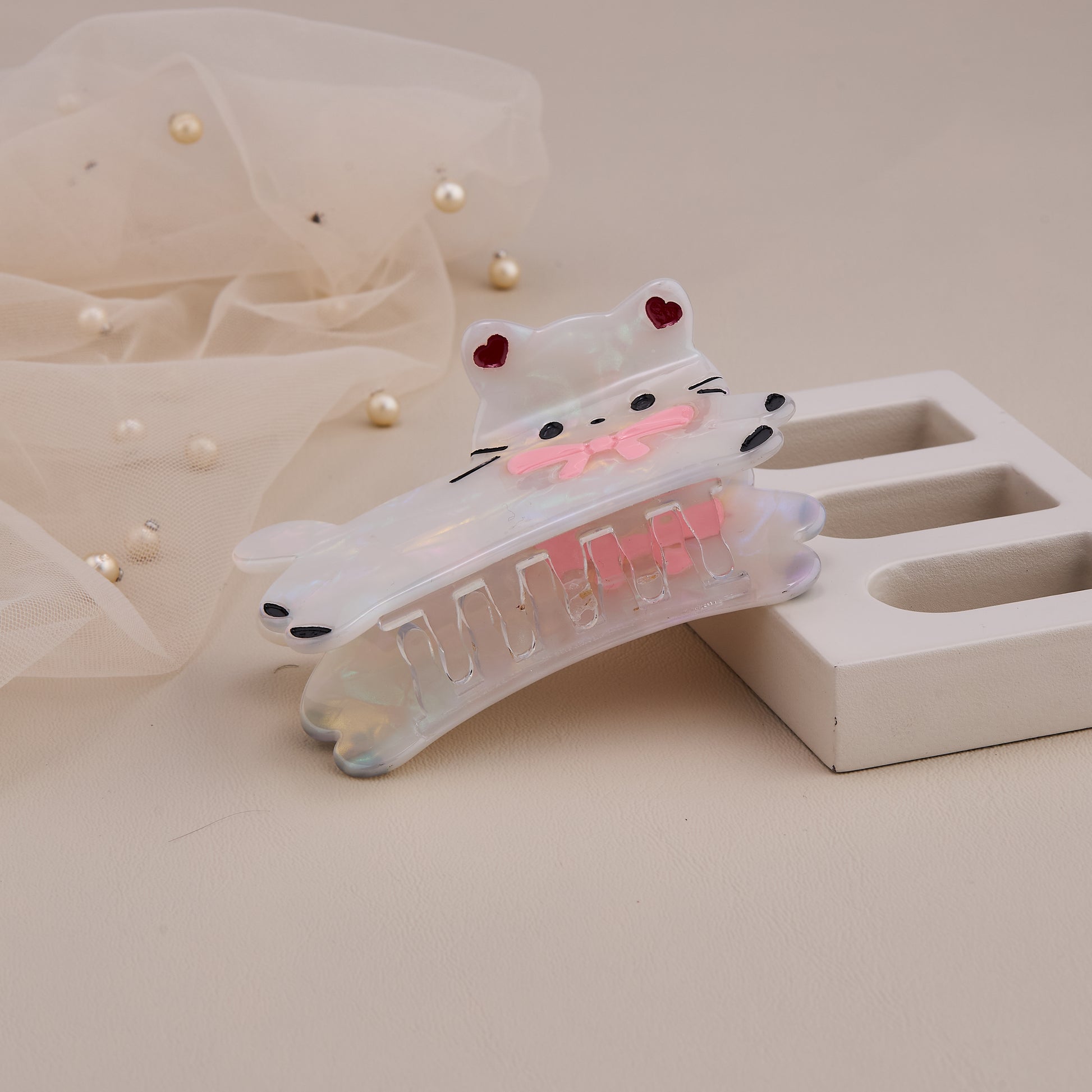 Adorable cat-shaped hair claw clip featuring a pink bow and glossy pearl finish. Made from high-quality acrylic for durability and a strong grip without pulling hair. Perfect for daily use, parties, or gifting — adds a sweet and playful charm to any hairstyle.