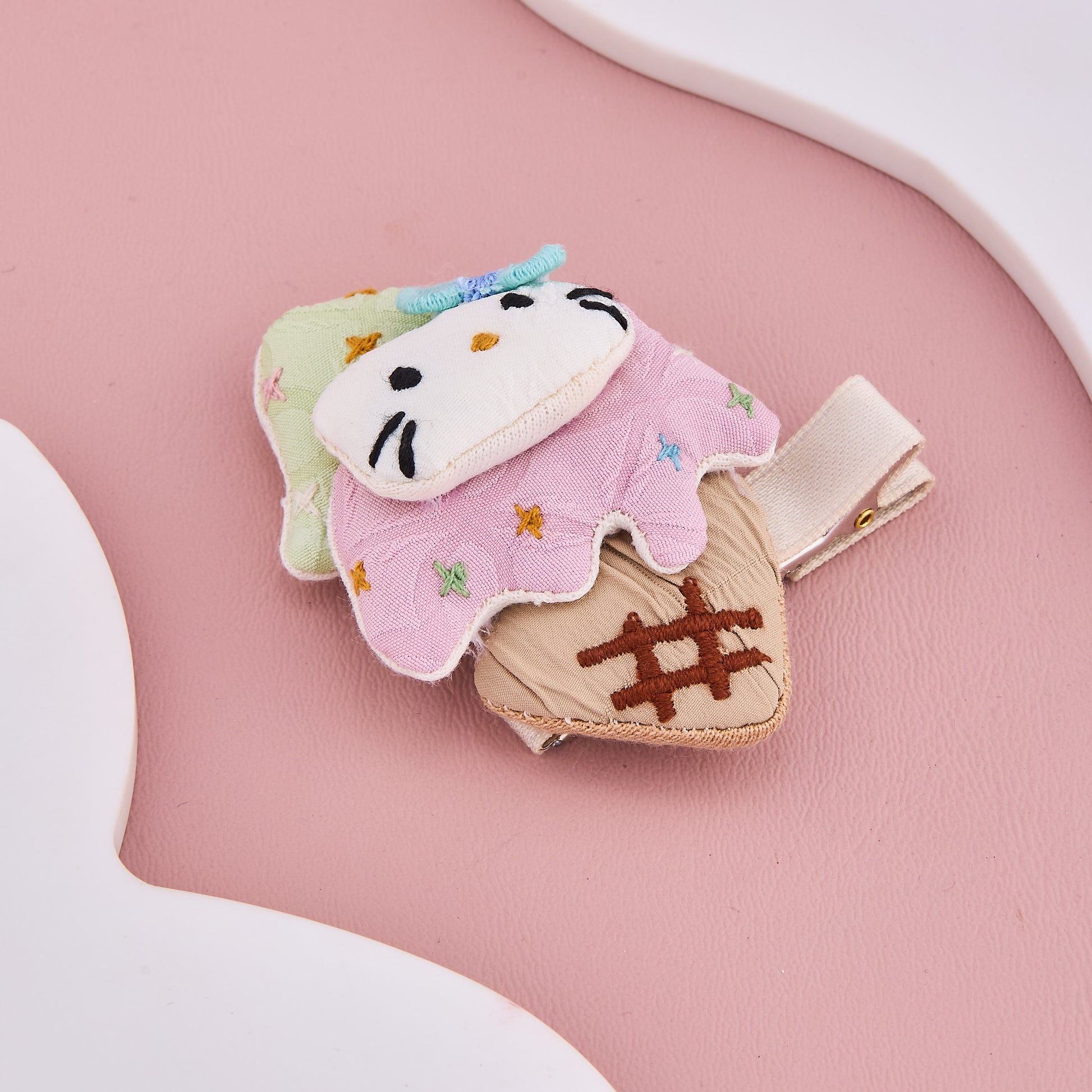 This adorable hair clip features a soft ice cream cone design topped with a cute cat face, decorated with pastel embroidery. Made from gentle fabric, it’s perfect for baby girls, adding a playful and charming touch to any hairstyle. Ideal for parties and everyday wear.