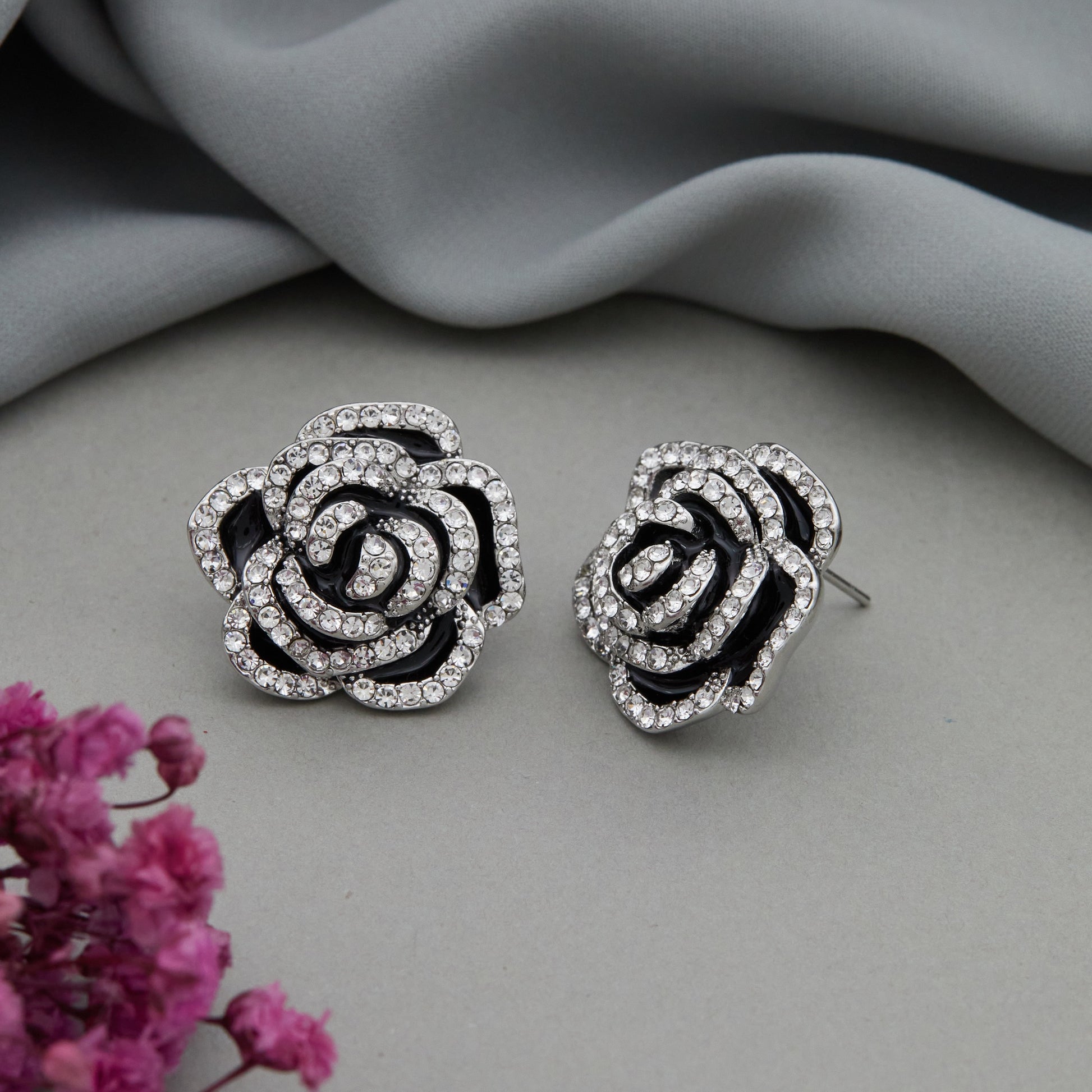 a pair of diamond earrings with an elegant and luxurious design, complemented by a delicate rose that evokes beauty and nature. Set against a soft fabric background, the display enhances the refined aesthetic of these stunning jewelry pieces.