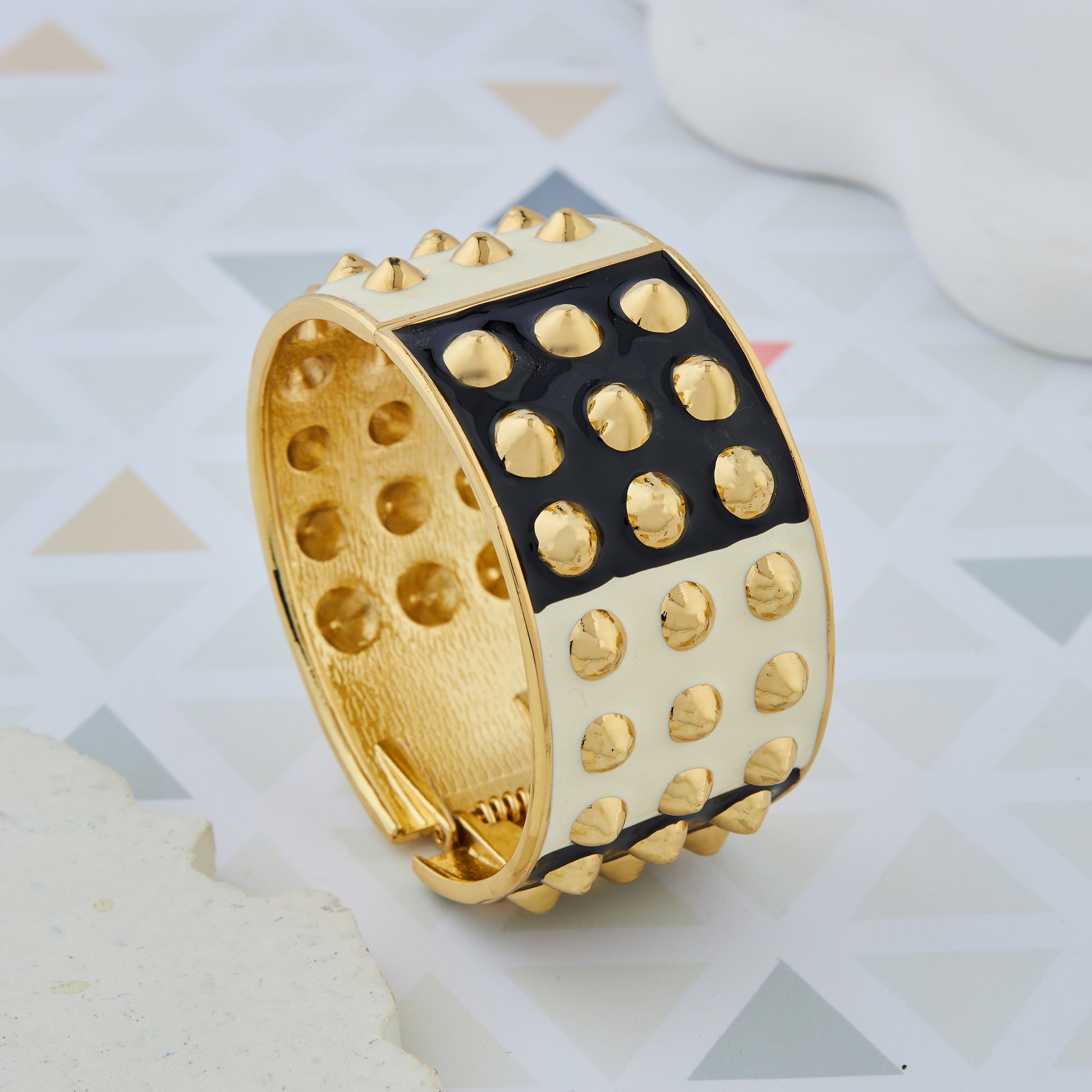 Unleash your bold side with the Edge Strike Spiked Bracelet by GC Premium Jewellery. Featuring a fierce design with gold-toned spikes on a sleek black band, this bracelet merges modern glam with a rebellious edge. Perfect for adding attitude to both casual streetwear and elevated evening looks.