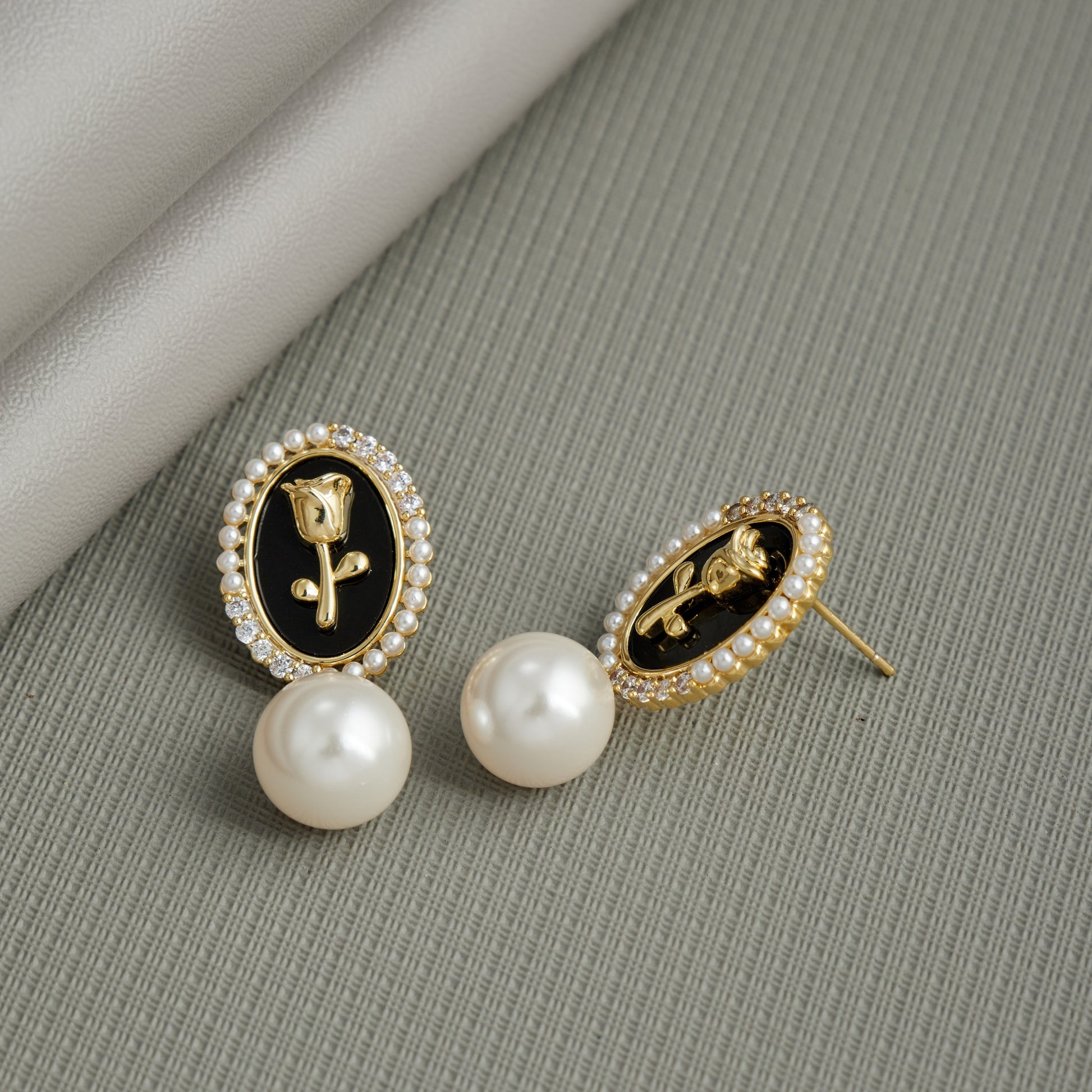 Elegant Black & Gold Rose Stud Earrings with Pearl Drop