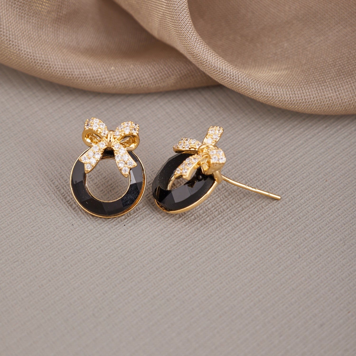 The Earrings feature a stylish pair of earrings adorned with striking black stones and a delicate bow design. These chic fashion accessories showcase intricate craftsmanship and add a touch of elegance and uniqueness to any outfit, making them perfect for those who appreciate distinctive jewelry pieces.