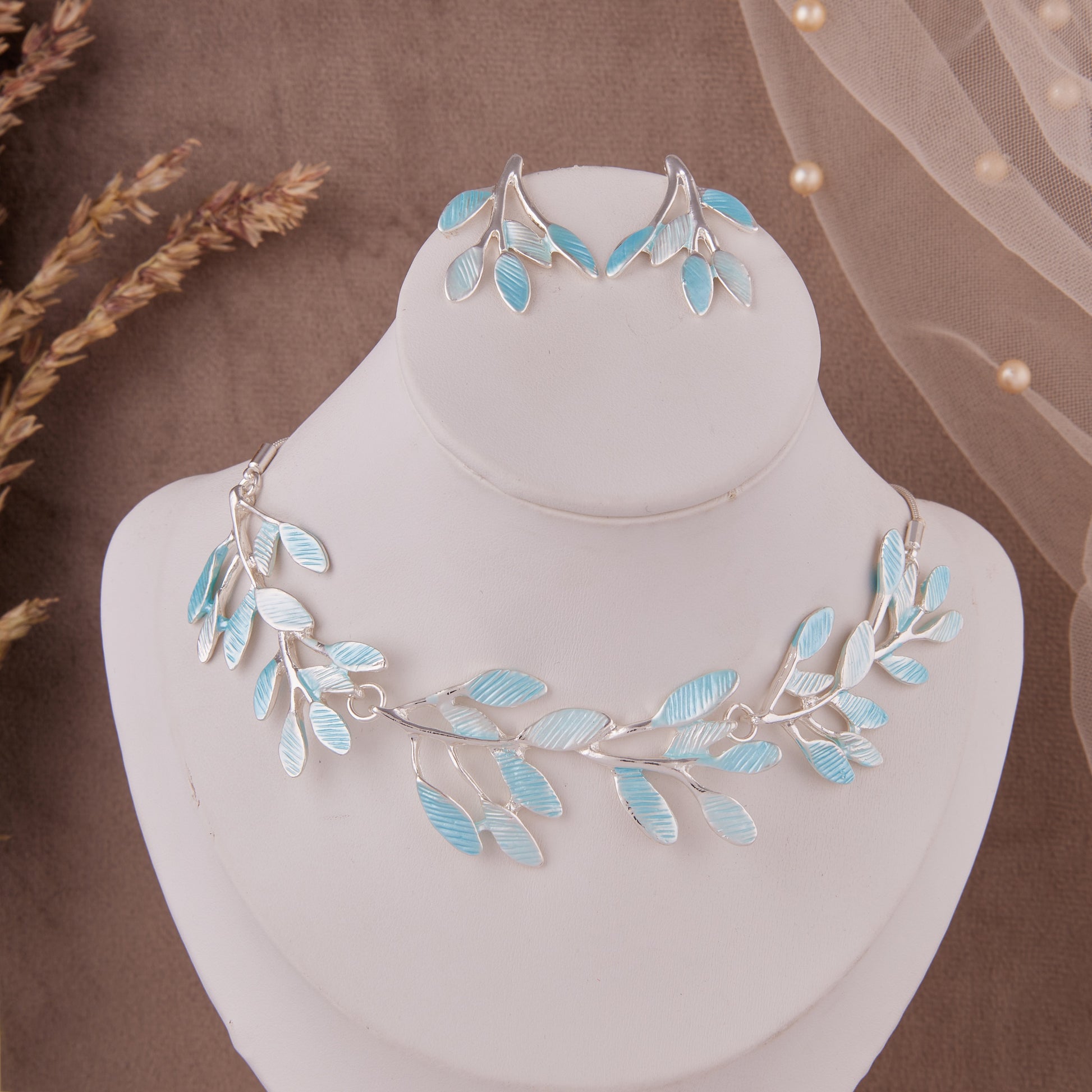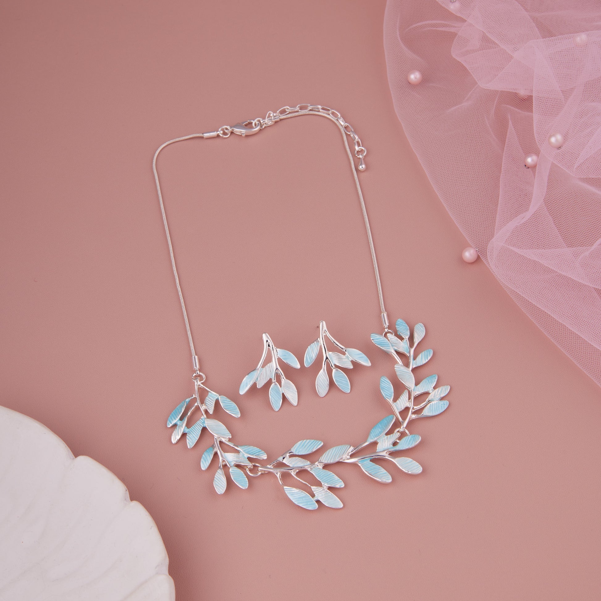 Delicate leaf design necklace set in silver-tone with soft blue enamel. Comes with matching earrings. Perfect for casual outings, festive wear, and gifting. Lightweight & comfortable.