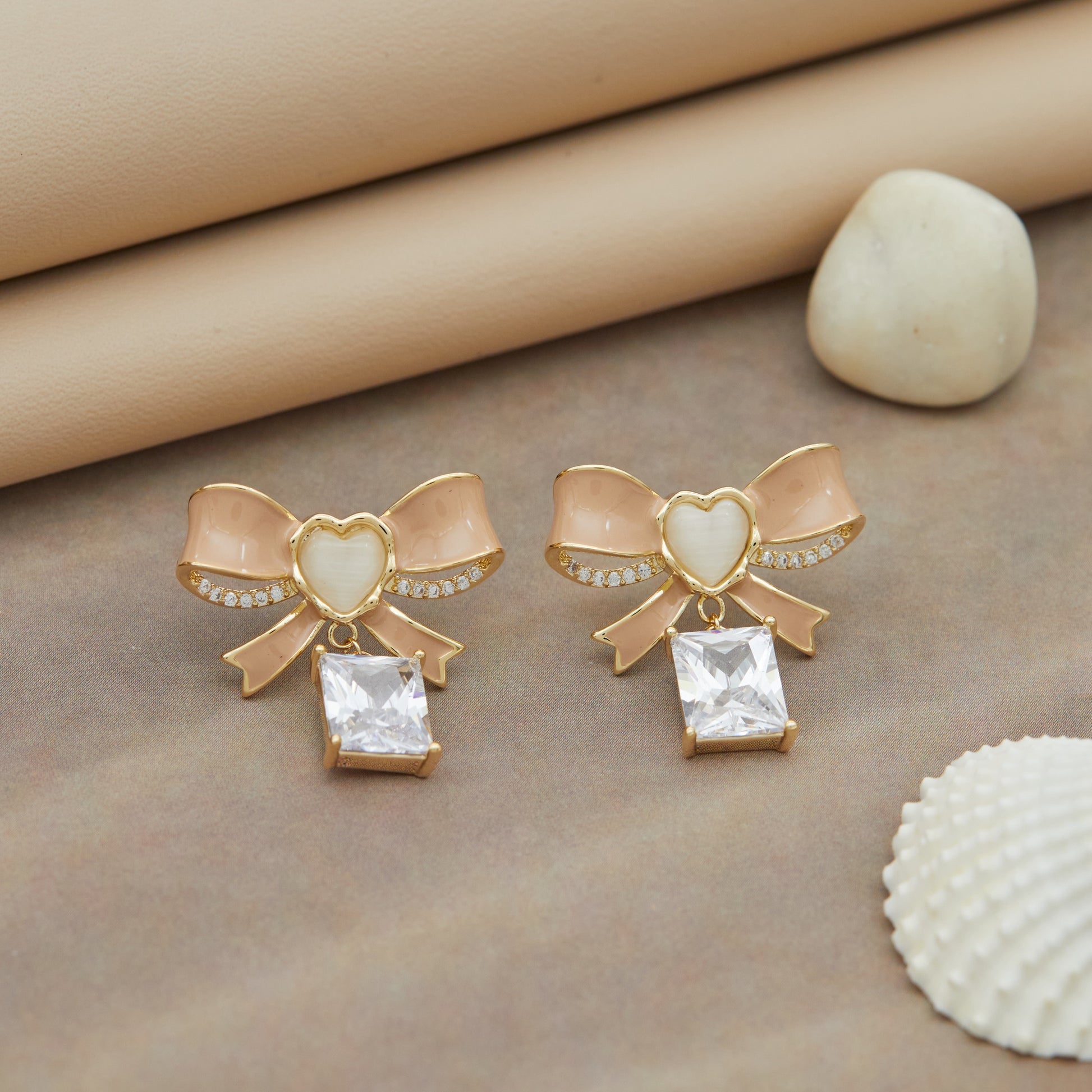 pair of charming earrings designed in the shape of delicate bows. These earrings combine a soft peach enamel with gold accents, centered by a heart-shaped detail and encrusted with tiny crystals along the edges. Below each bow hangs a sparkling rectangular gemstone, adding a sophisticated touch. This stylish and feminine design makes them a perfect fashion accessory for special occasions or adding a graceful flair to everyday outfits.