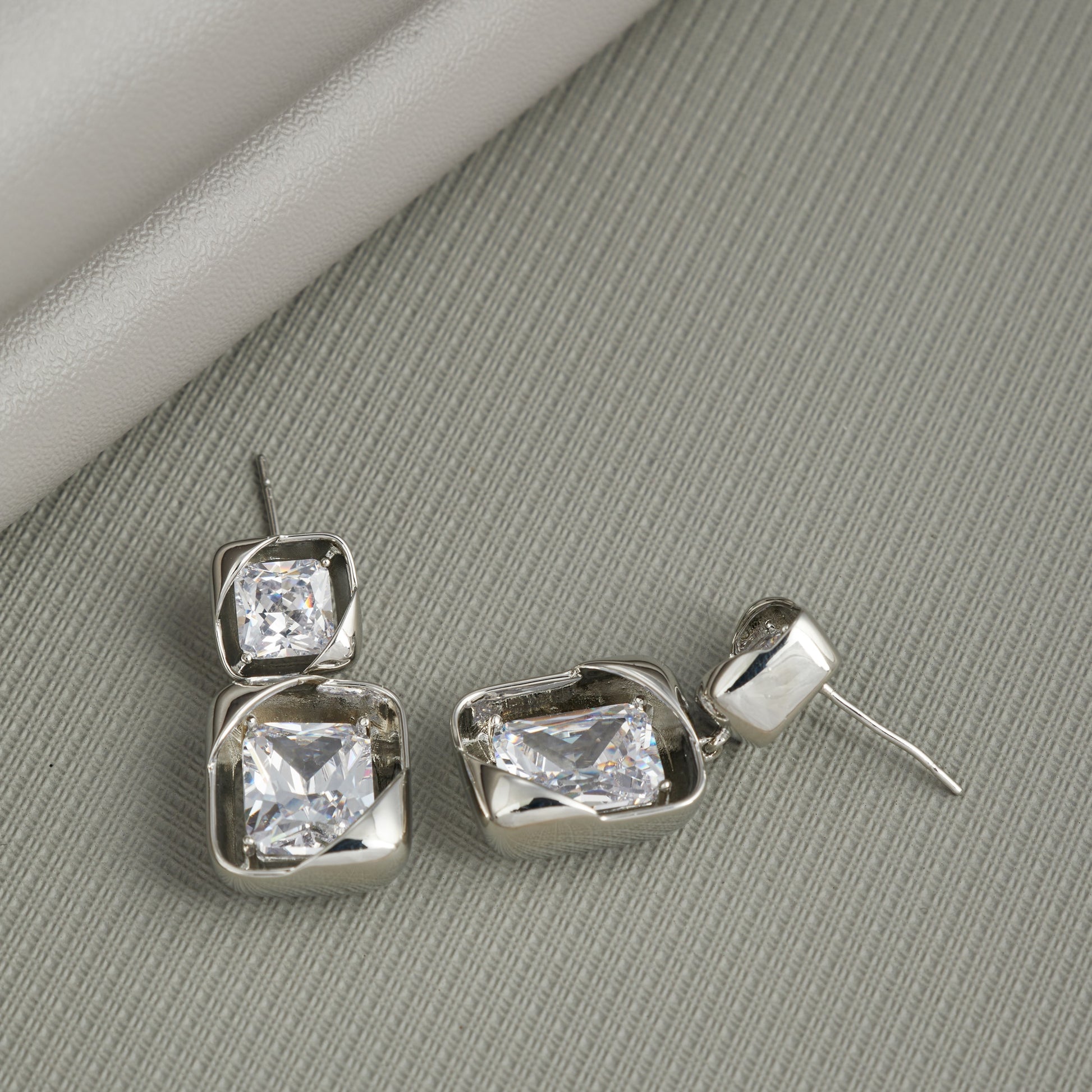 Elegant Dual Square Crystal Drop Earrings with Silver Finish for Women & Girls