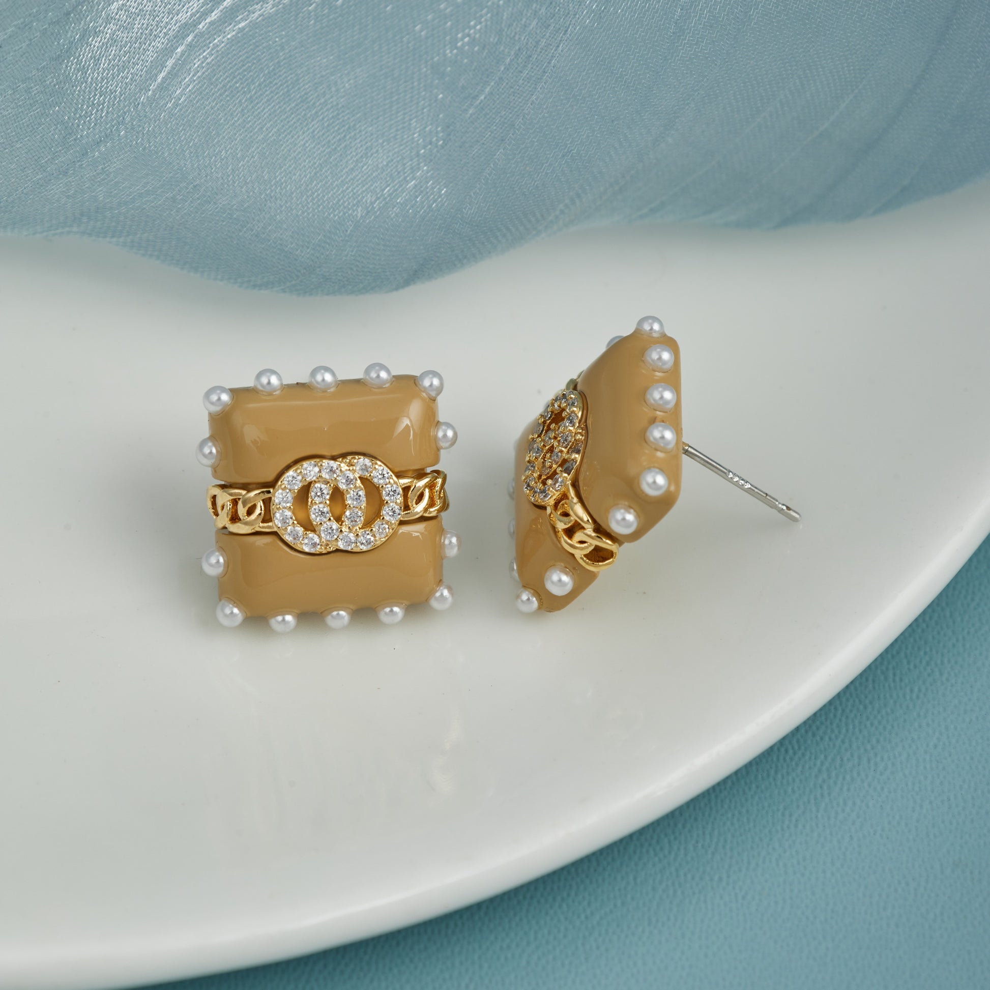 A pair of earrings displayed in an artistic and elegant setting, showcasing their stylish design. The focus remains entirely on the earrings as a fashionable accessory.
