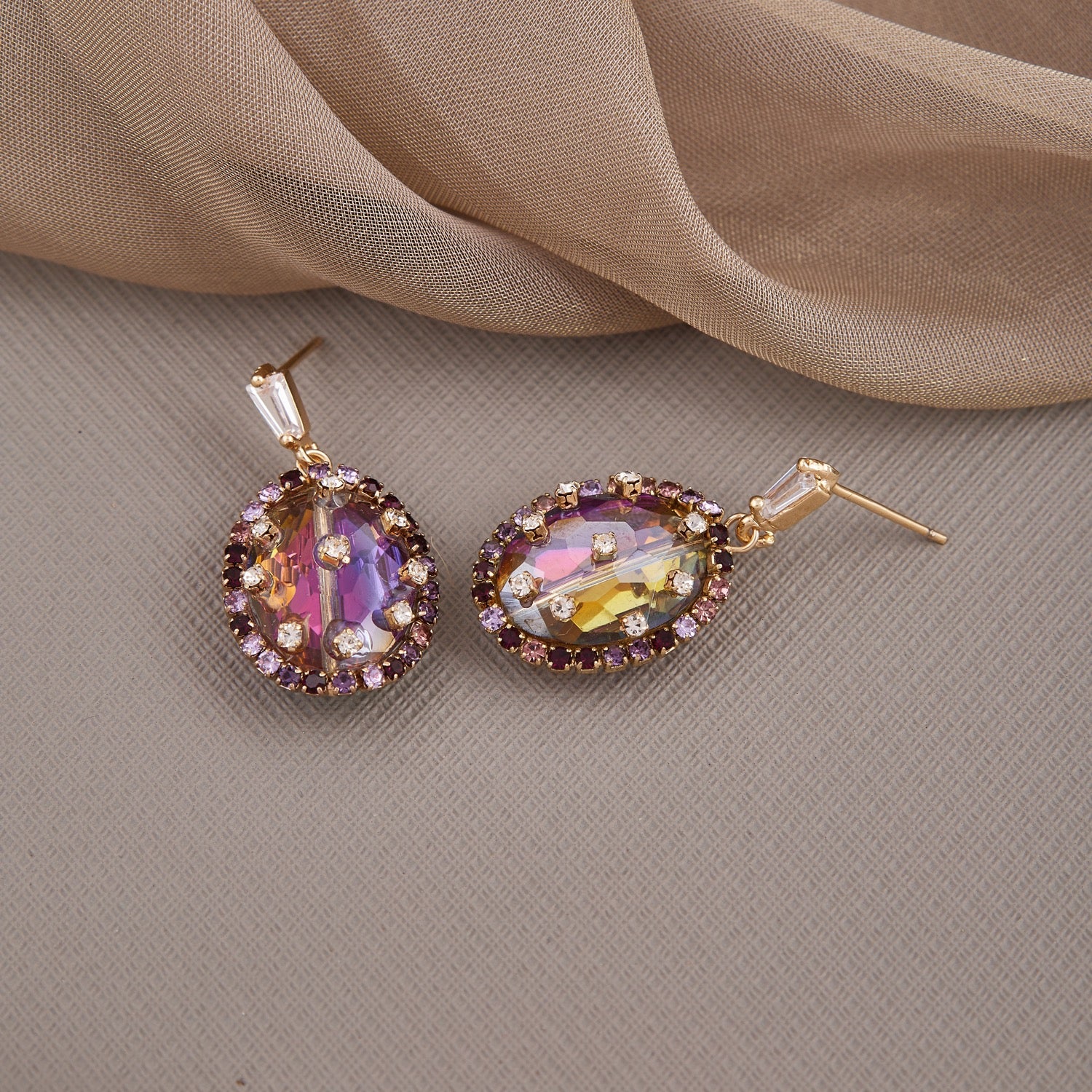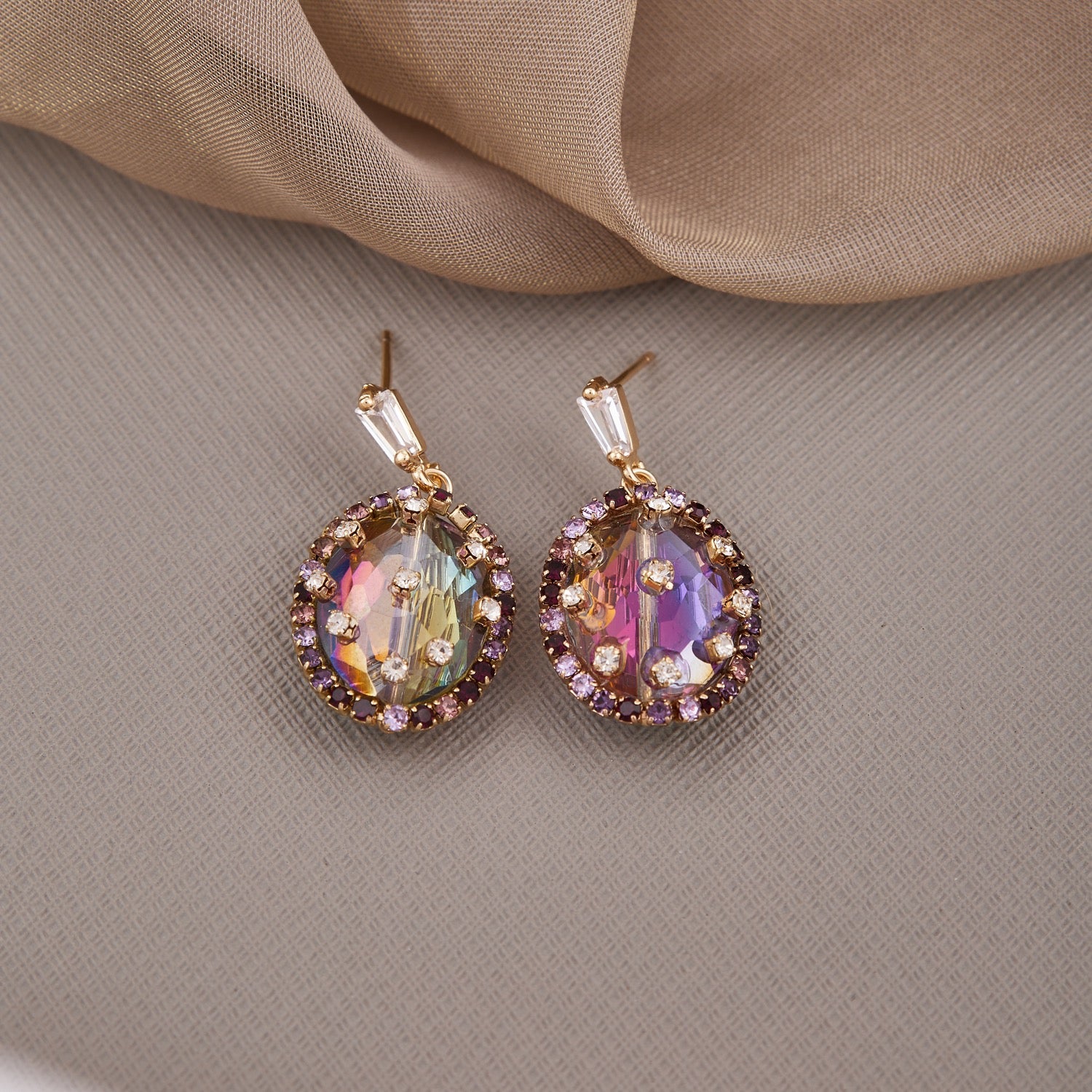 These earrings feature a beautifully crafted design embellished with shimmering gemstones. The intricate detailing highlights the artistry of jewelry making, combining elegance and sparkle. Perfect as fashionable body jewelry, they add a glamorous bling-bling touch to any ensemble.