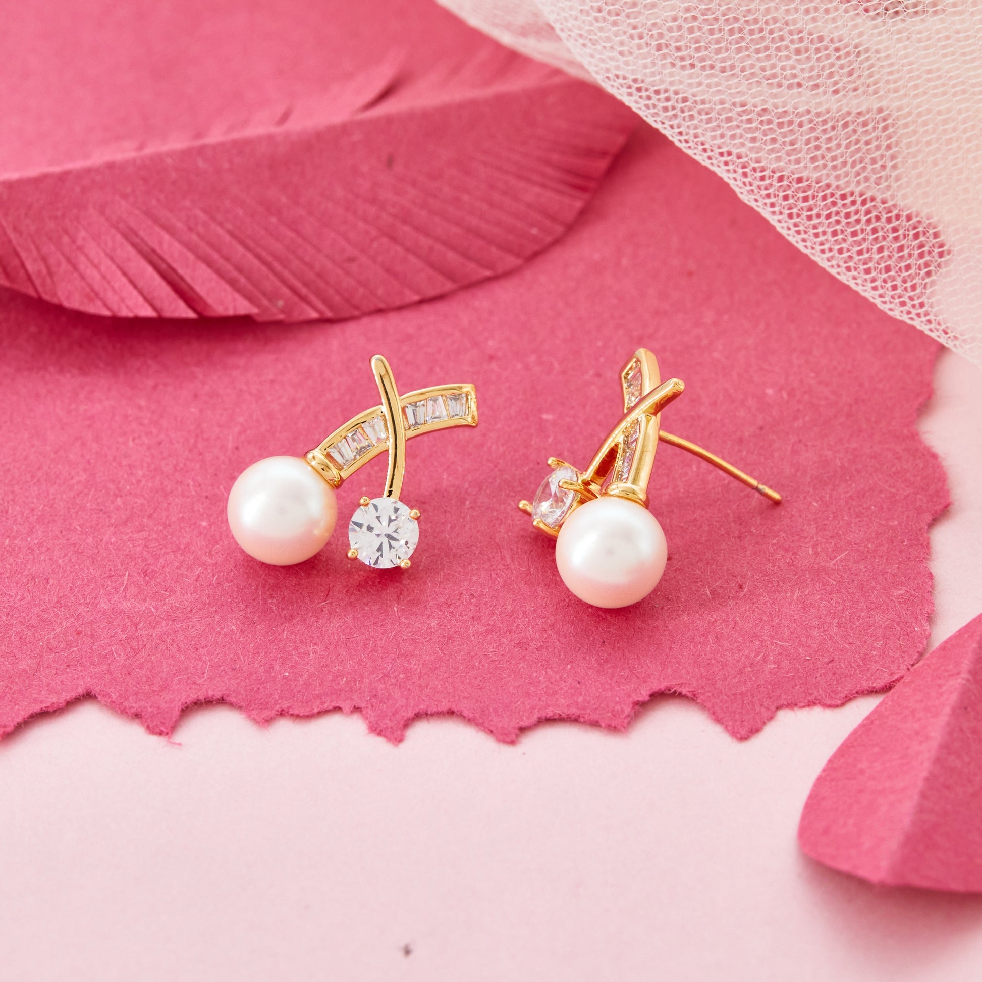 The earrings feature a pair of elegant gold earrings adorned with lustrous pearls and sparkling diamonds. Displayed on a soft pink paper background, the luxurious design stands out beautifully. Crafted as a sophisticated fashion accessory, these earrings are perfect for adding grace and charm to indoor occasions.