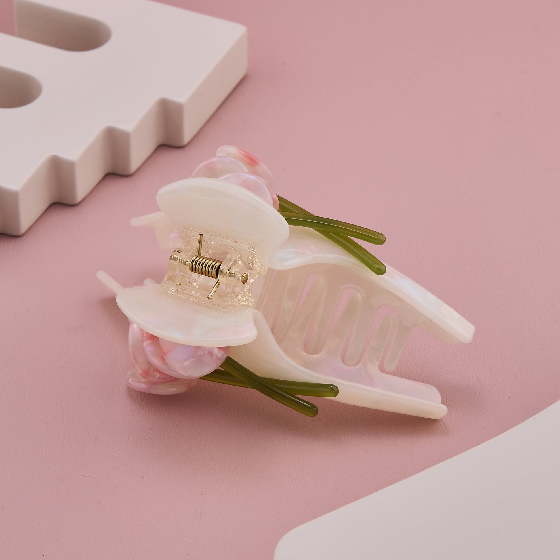 Bring a touch of floral grace to your look with this elegant lily-inspired hair claw clip. Designed in a glossy pearl-white finish with delicate pink flower accents and soft green stems, it beautifully blends sophistication with femininity. Crafted from high-quality acrylic, this clip ensures a firm grip while adding a refined charm to your hairstyle. Perfect for casual outings, festive occasions, or gifting someone special who loves floral beauty.