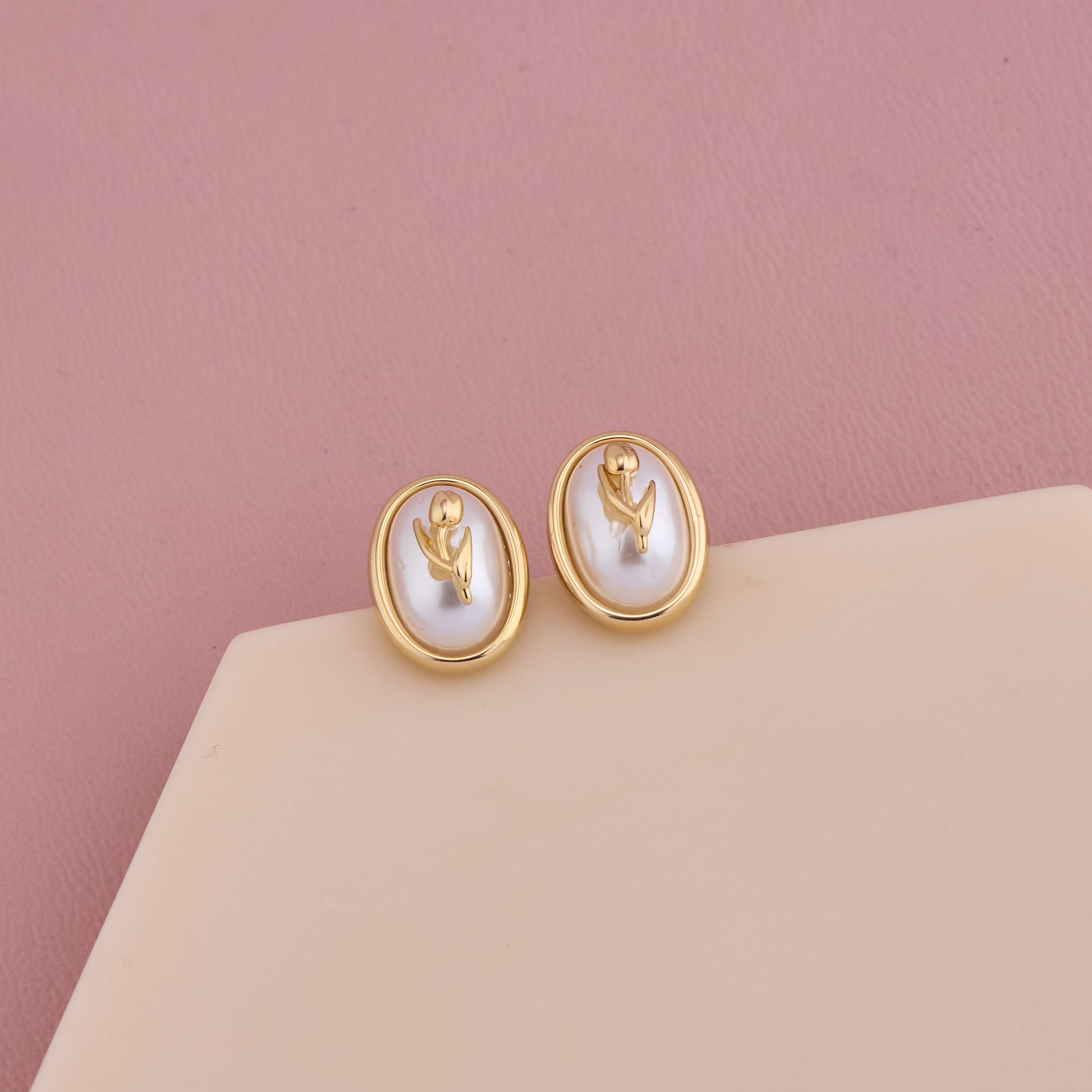 Elegant Oval Pearl Stud Earrings with Golden Floral Motif