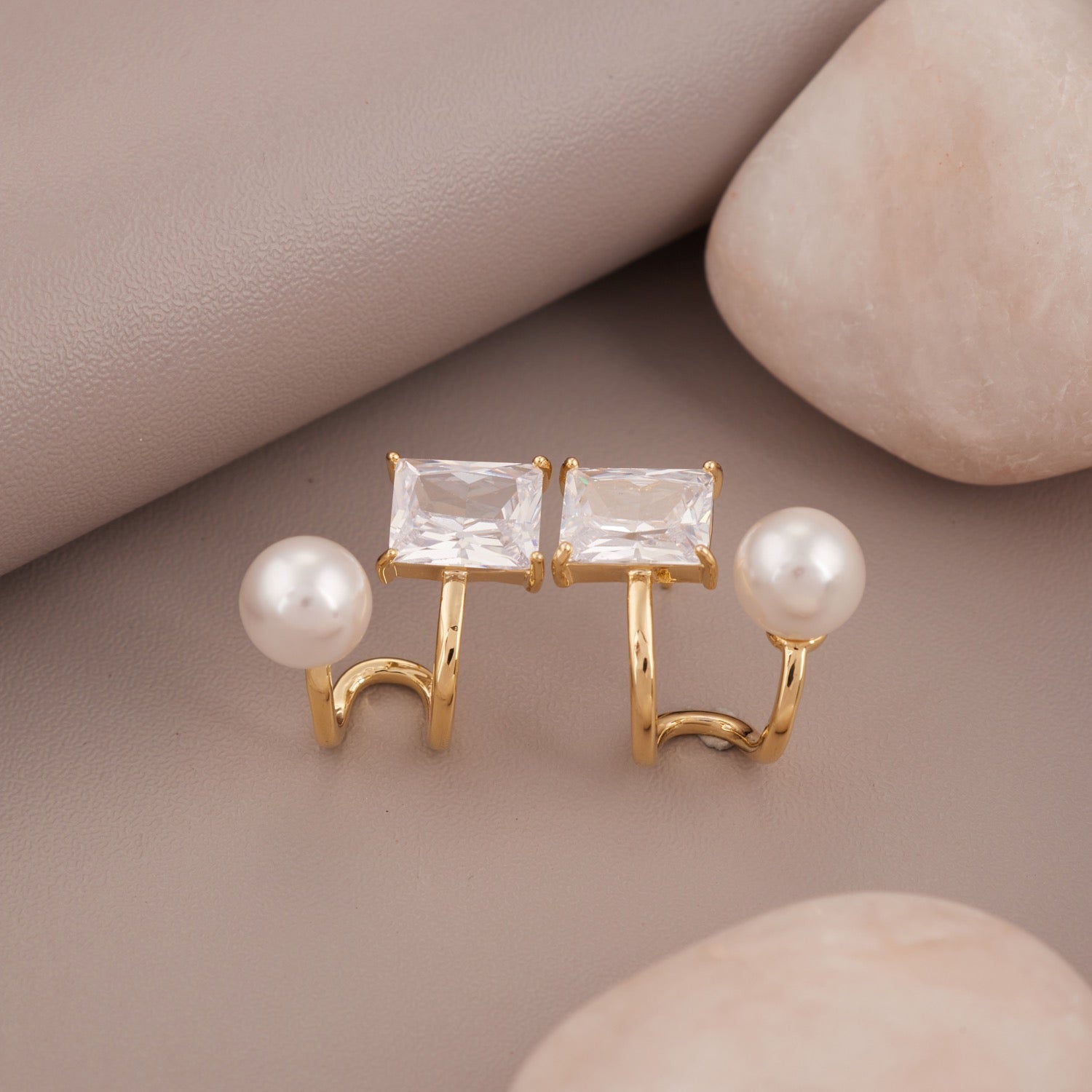 This image showcases a pair of elegant earrings adorned with luminous pearls, displayed in an indoor setting that highlights their intricate craftsmanship. Designed with a refined and stylish aesthetic, these earrings are perfect for enhancing any outfit — from everyday chic to formal elegance. A true testament to timeless fashion and sophistication.