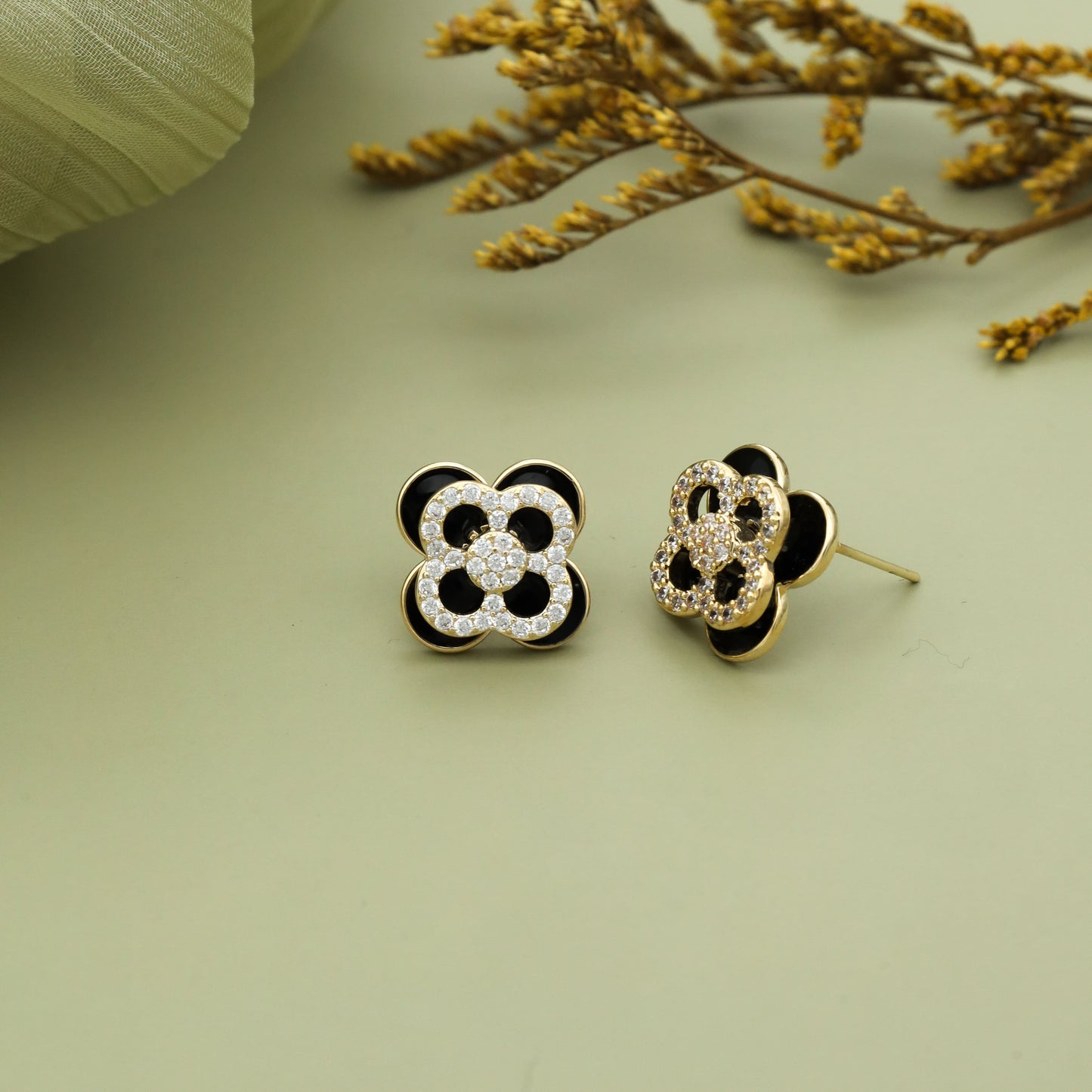 Floral Clover Stud Earrings – Black & Gold Elegance with Crystal Accents