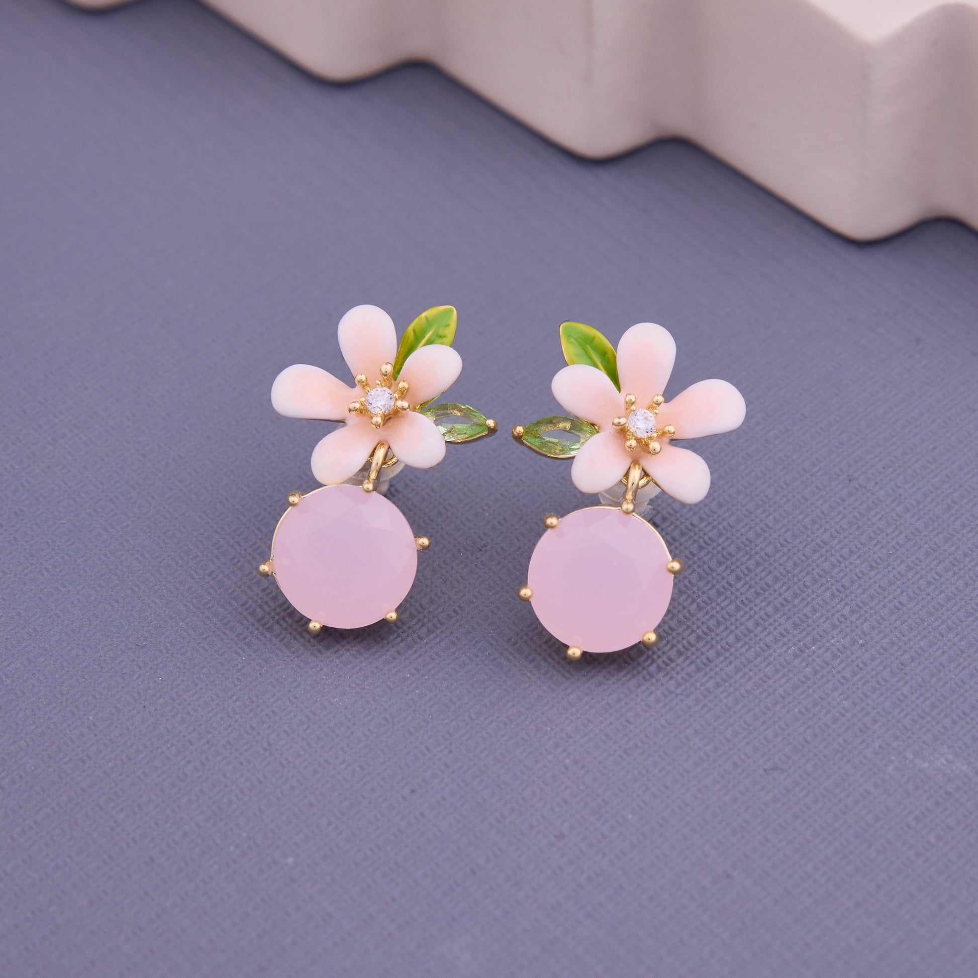 This elegant pair of earrings features intricate floral elements accented with embedded stones. The delicate petal-like details and vibrant colors create a stunning accessory that embodies both natural beauty and refined craftsmanship. These earrings are designed to add charm and sophistication to any look, making them a standout addition to any jewelry collection.