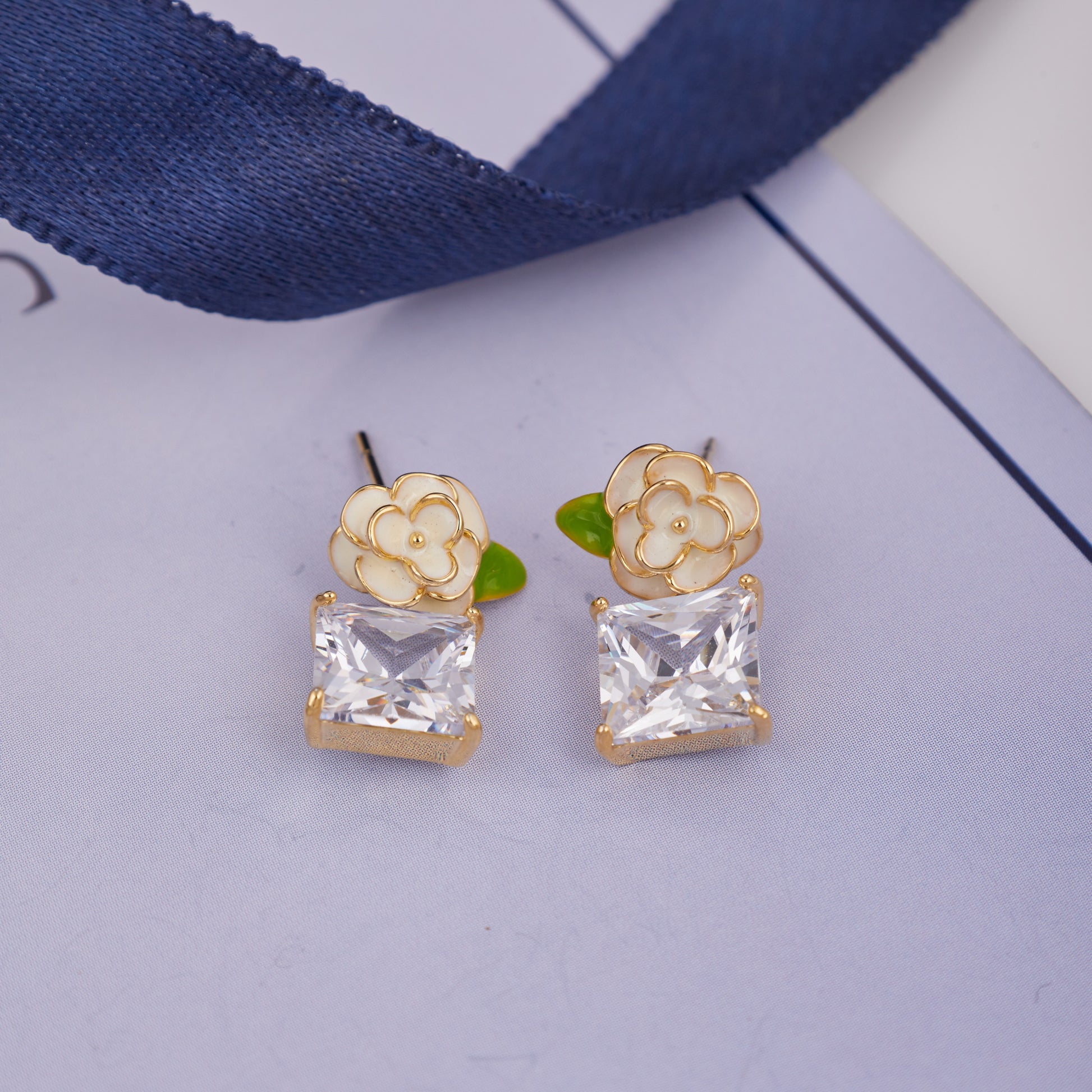 The earrings feature a graceful pair of accessories adorned with delicate flowers on top, combining nature-inspired beauty with sophisticated design. Embellished with gemstones and sparkling diamonds, they exude charm and brilliance, making them an ideal choice for those who appreciate elegant body jewelry. Perfect as a fashionable statement piece, these earrings shine beautifully in indoor settings and elevate any outfit with their refined appeal.