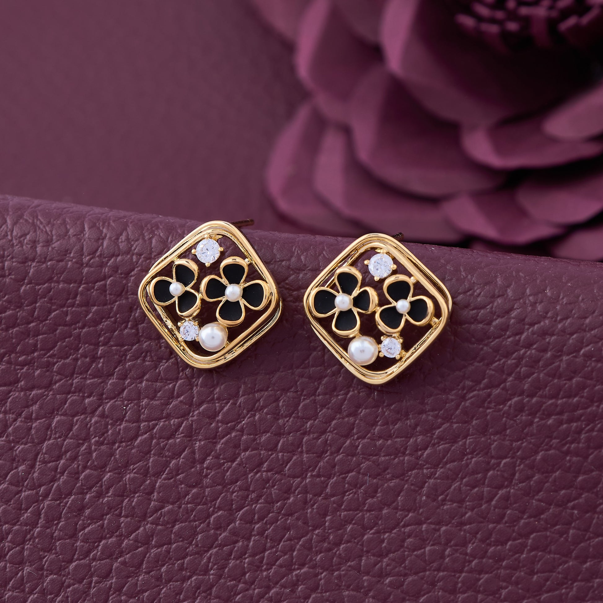 These graceful square stud earrings feature delicate gold floral motifs accented with black enamel, lustrous pearls, and sparkling stones. The intricate design combines timeless charm with modern sophistication, making them the perfect accessory for both casual and formal occasions.