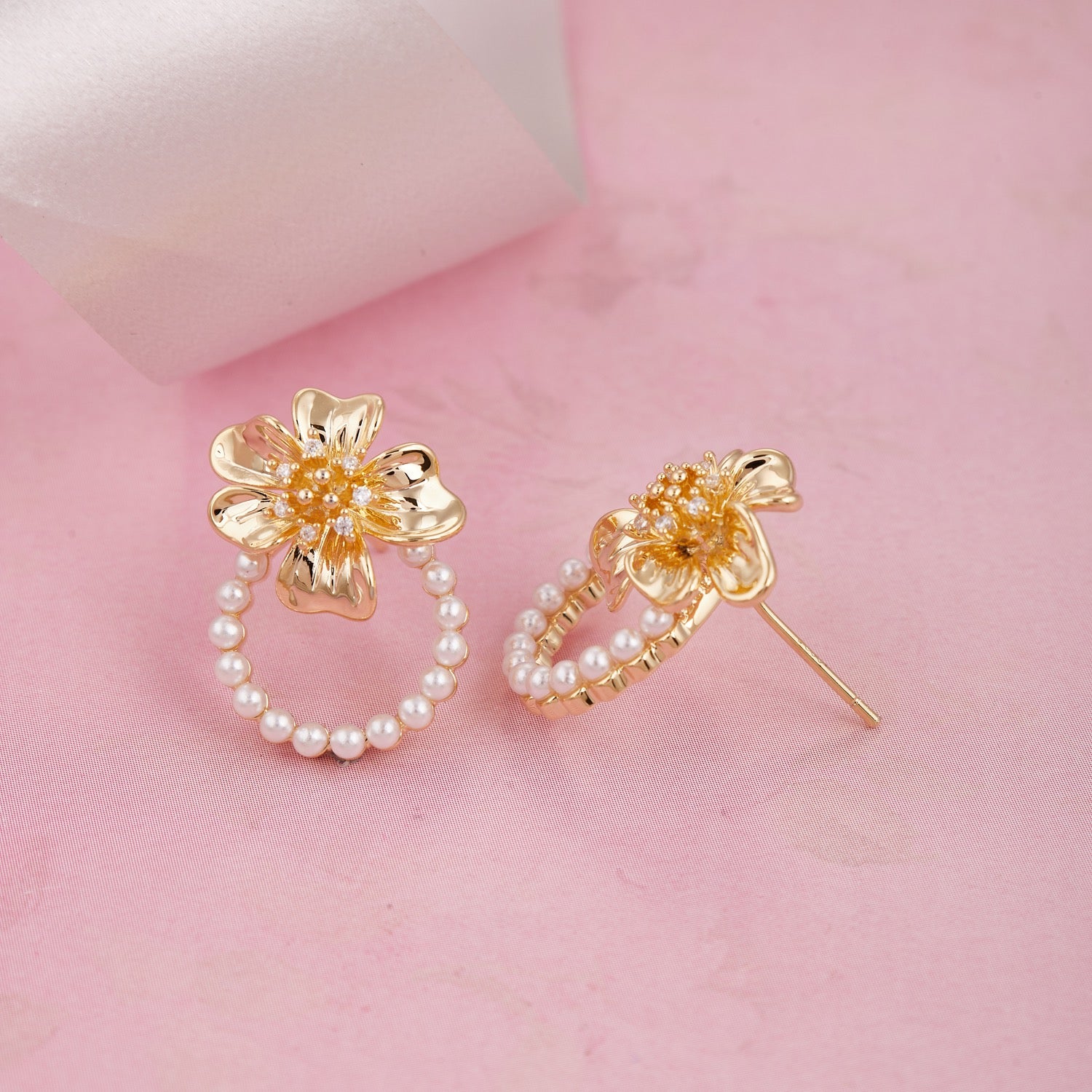 Elegant gold floral earrings with a delicate pearl loop. Perfect for weddings, parties, or festive looks. Lightweight, charming, and versatile for women & girls.