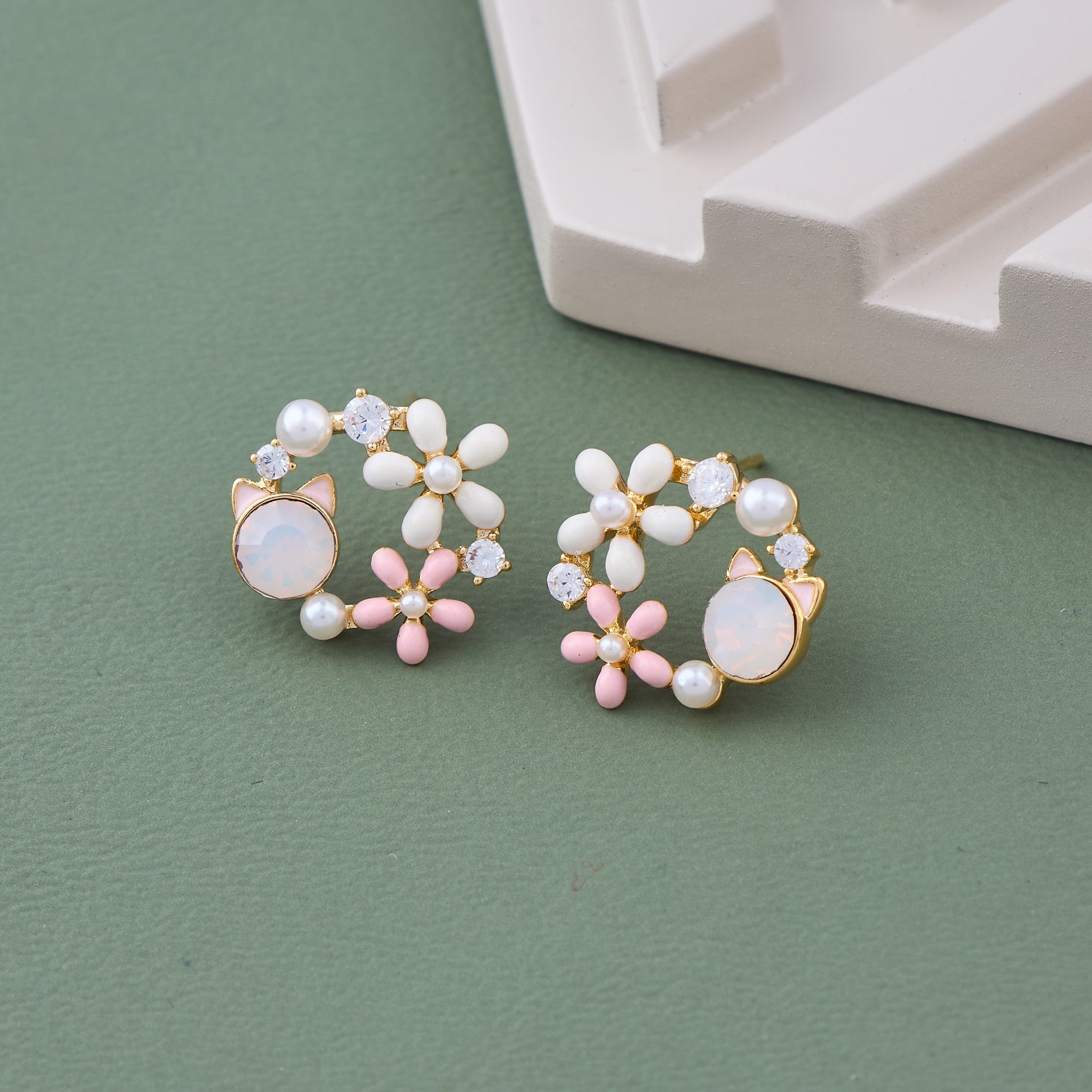The Earrings feature a delicate pair of floral wreath earrings crafted in gold-tone metal. Adorned with petite white and pink flowers, shimmering crystals, and tiny pearls, they form a graceful circular design. An opalescent stone with subtle cat-ear accents adds a playful yet elegant charm. These earrings are perfect for bringing a fresh, romantic, and whimsical touch to any outfit.