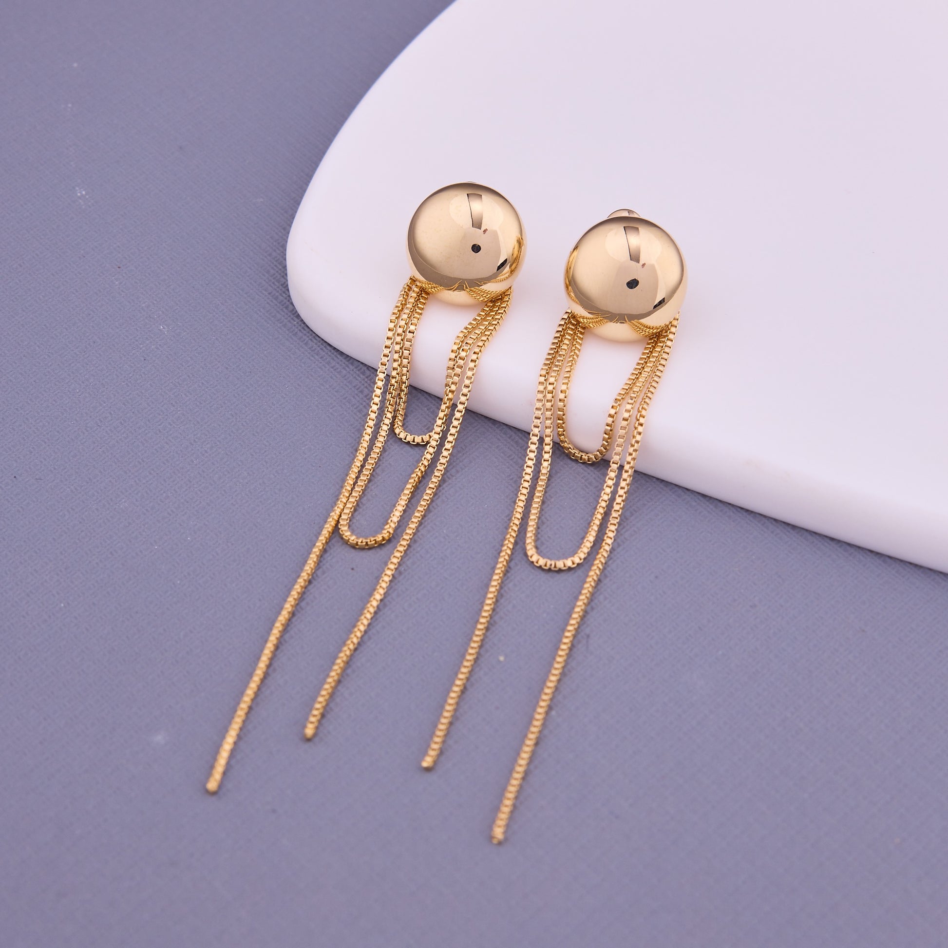 This pair of gold earrings features a sleek, metallic finish complemented by delicate chain details, adding movement and modern flair to their design. The shiny surface and elegant craftsmanship make them a stylish and versatile accessory, perfect for elevating both casual and formal looks.