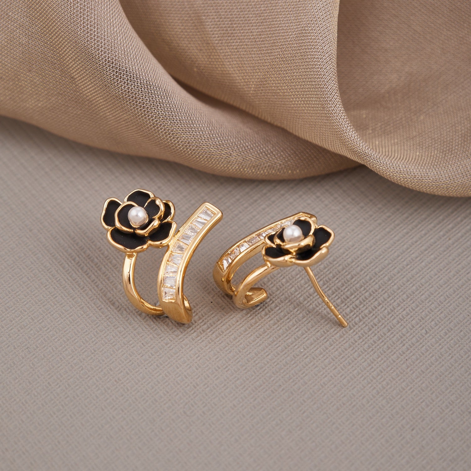 The Earrings feature a pair of gold earrings adorned with delicate black and white flowers. These fashion accessories present an elegant blend of colors and intricate floral motifs, making them a stylish and versatile choice to complement any outfit.