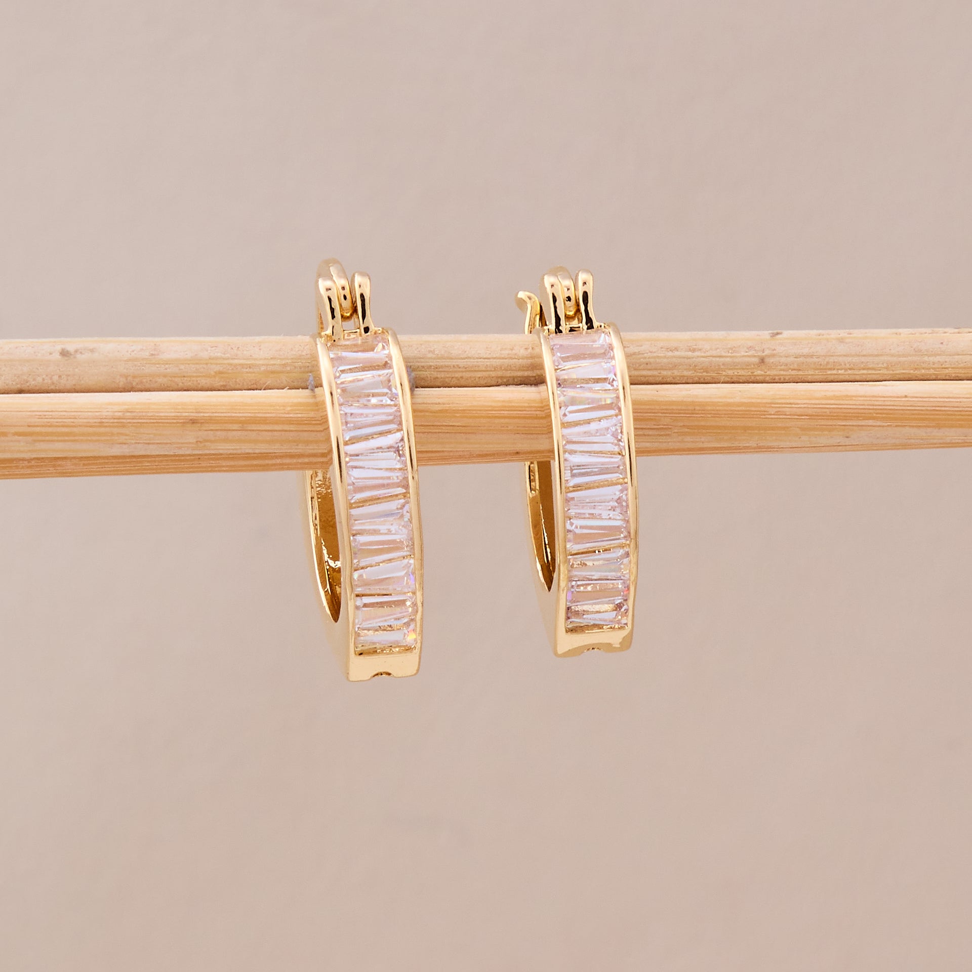 Gold Heart Hoop Earrings with Baguette-Cut CZ Stones