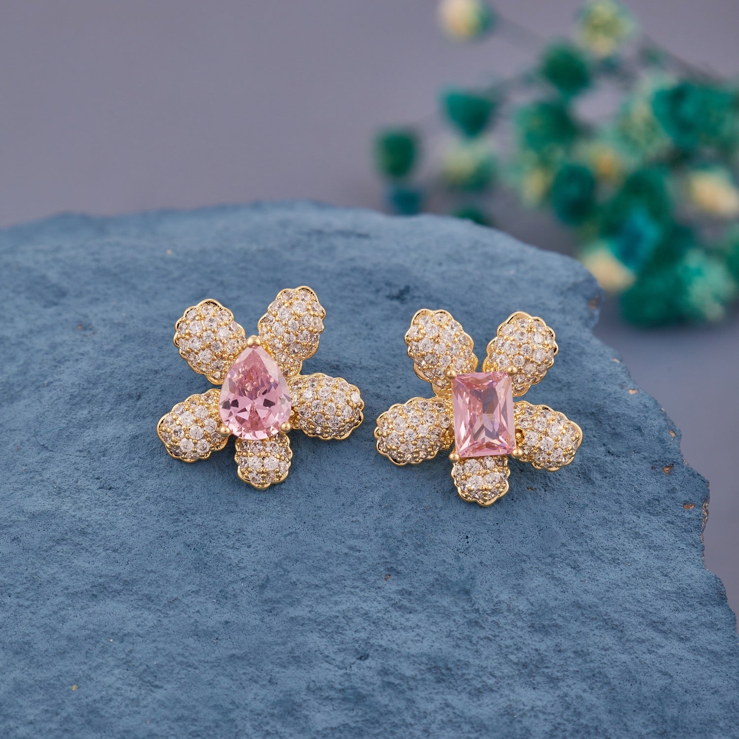 Dazzling gold-toned floral stud earrings adorned with five intricately encrusted petals of shimmering crystals, centered with a radiant pink gemstone in unique shapes—a teardrop and a rectangular cut. These earrings exude feminine charm and luxurious sparkle, perfect for adding a glamorous yet graceful touch to your ensemble for weddings, parties, or special occasions.