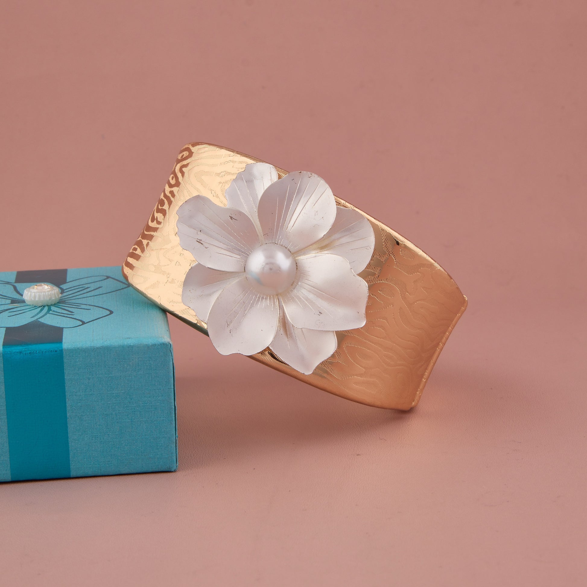 Make a bold and elegant impression with this gold-tone statement bracelet, featuring a beautifully sculpted frosted flower at the center. The wide textured band is etched with intricate patterns, adding depth and a handcrafted feel to the design. The oversized floral element showcases a pearl-like center, evoking natural grace and femininity. Ideal for weddings, festive occasions, or as a standout piece in your everyday jewelry collection, this bracelet blends artistry with charm for a look that’s both timeless and unique.