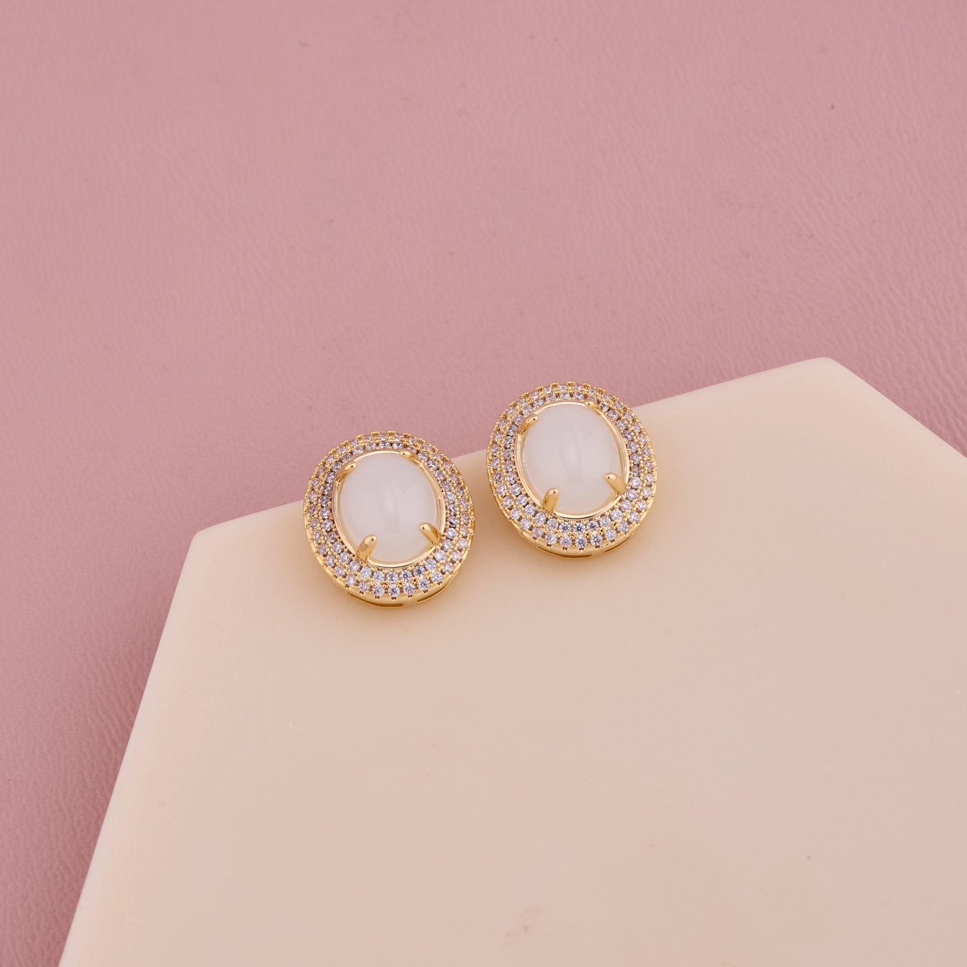 Golden Oval Stud Earrings with White Stone & Crystal Halo