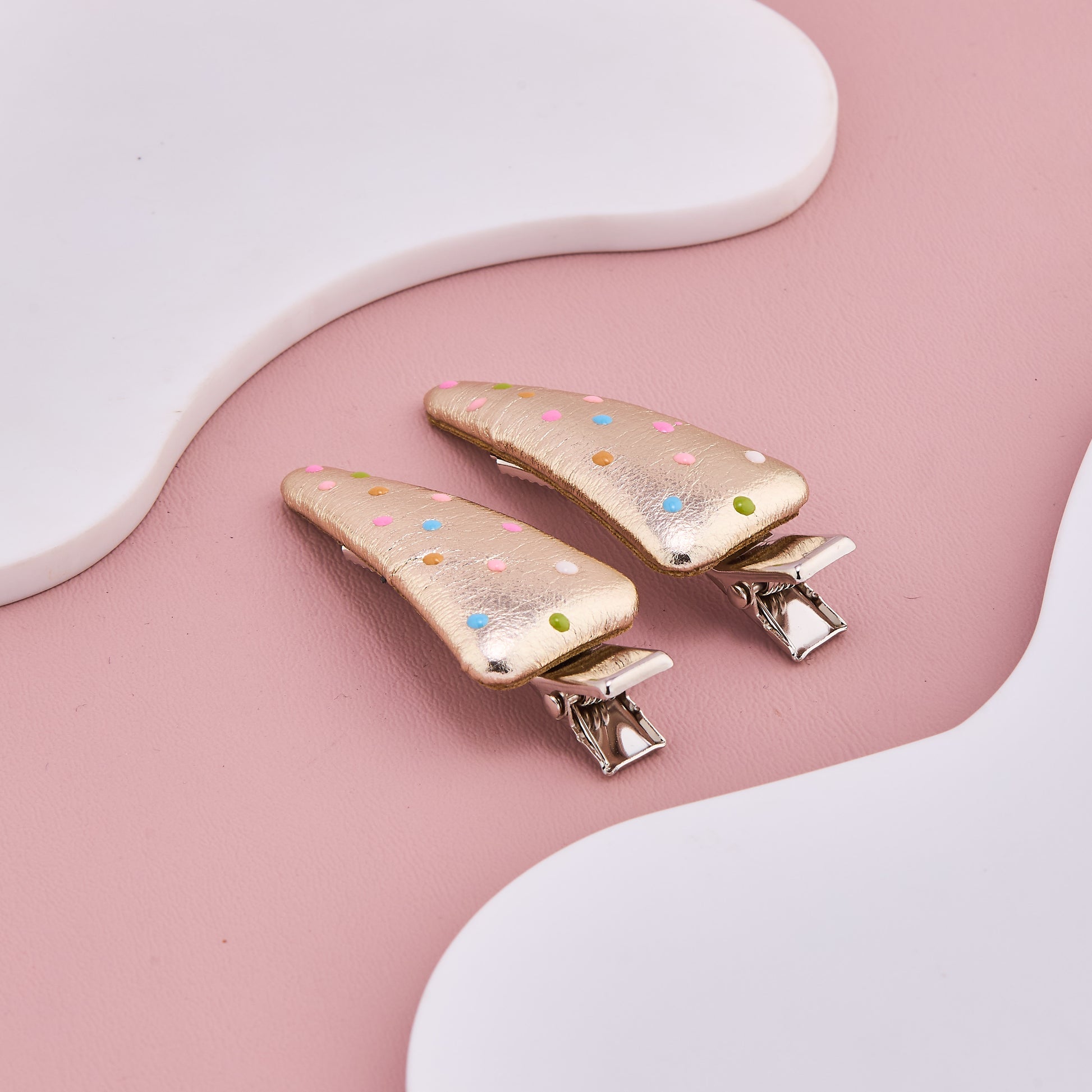 Stylish golden hair clips with colorful sprinkle detailing, designed to add a fun and elegant touch to your baby girl’s hairstyle. Lightweight and comfortable, these clips ensure a gentle grip while keeping hair neat and tidy. Perfect for daily wear, parties, or festive occasions.