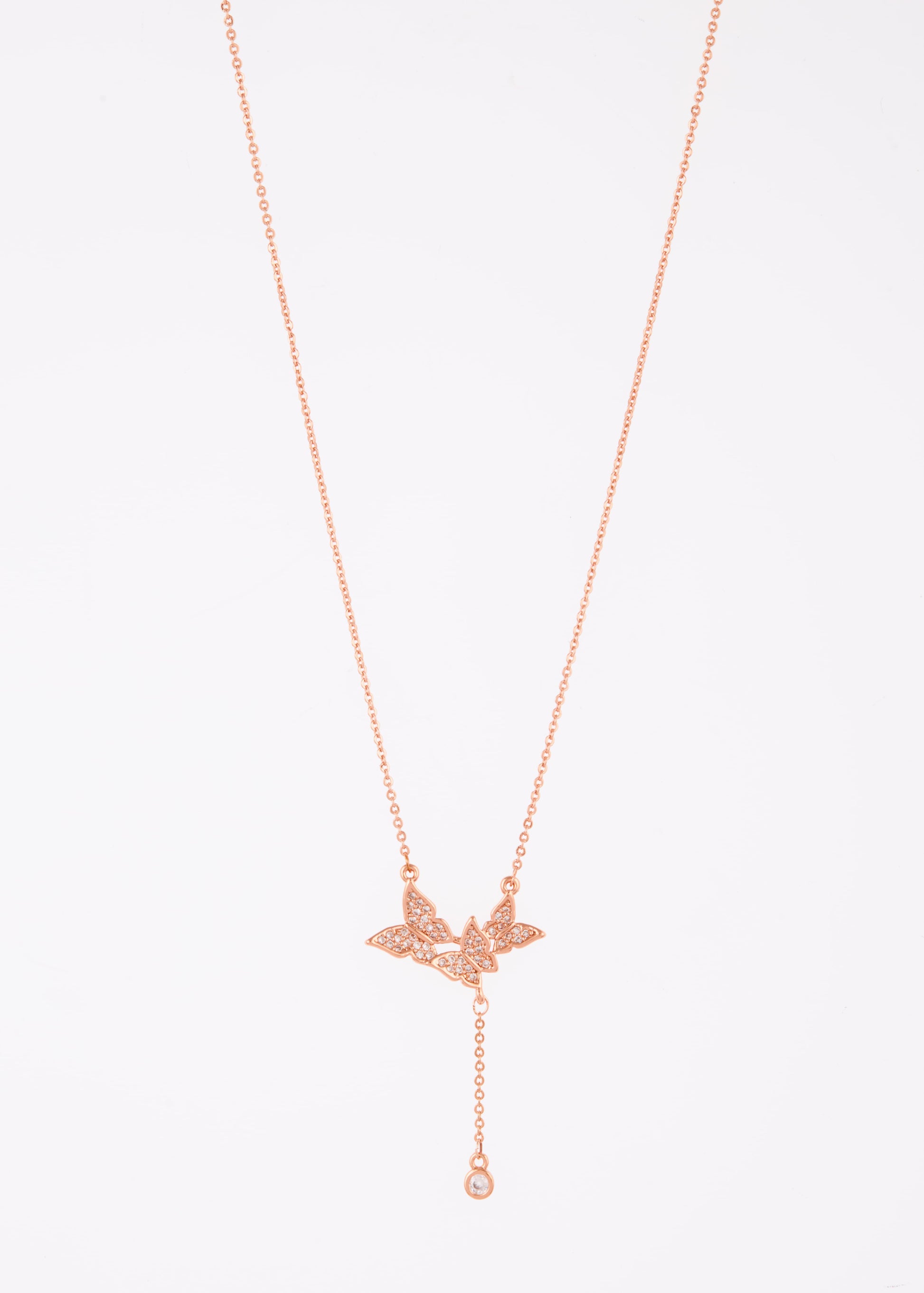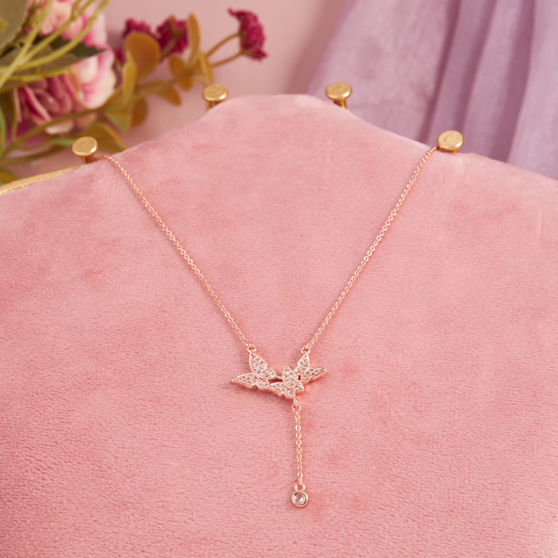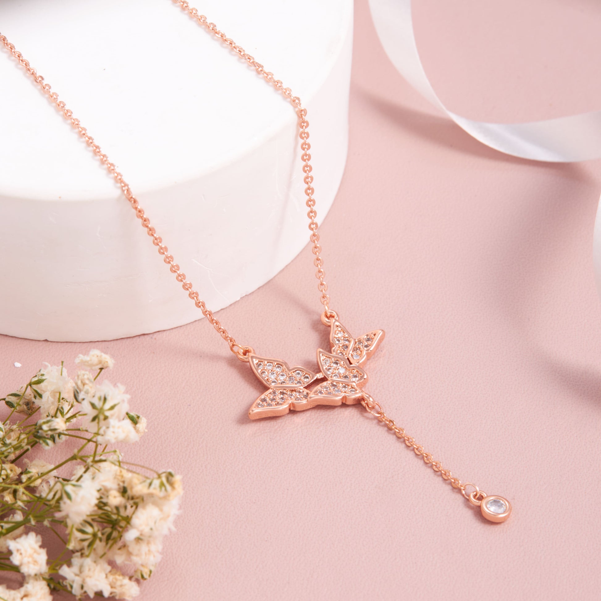 Embrace elegance and transformation with the Graceful Rose Gold Butterfly Pendant Necklace by GC Premium Jewellery. Featuring a delicate butterfly motif adorned with sparkling American Diamonds, this lariat-style necklace captures the essence of beauty in motion. The rose gold finish adds warmth and sophistication, while the drop-chain detail enhances its charm. Perfect for gifting or elevating your everyday ensemble.