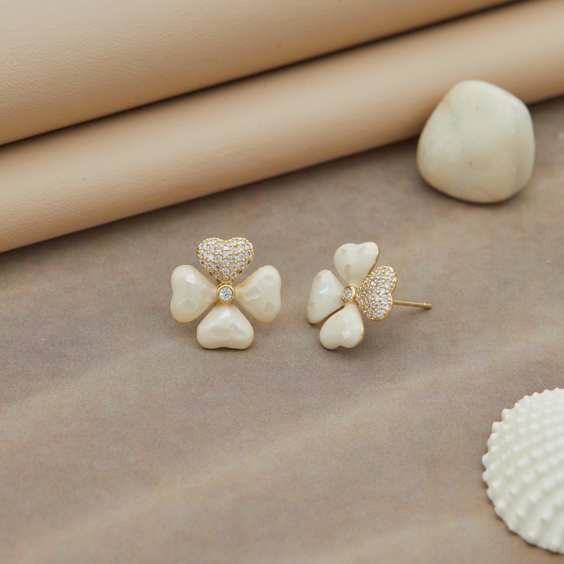 a sophisticated pair of stud earrings designed with a charming clover-like shape. Each earring has four creamy, heart-shaped petals accented by a sparkling central crystal. At the top, a gold heart encrusted with shimmering stones adds extra glamour to the design. These earrings beautifully combine playful elegance and sparkle, making them an ideal fashion accessory for any occasion.