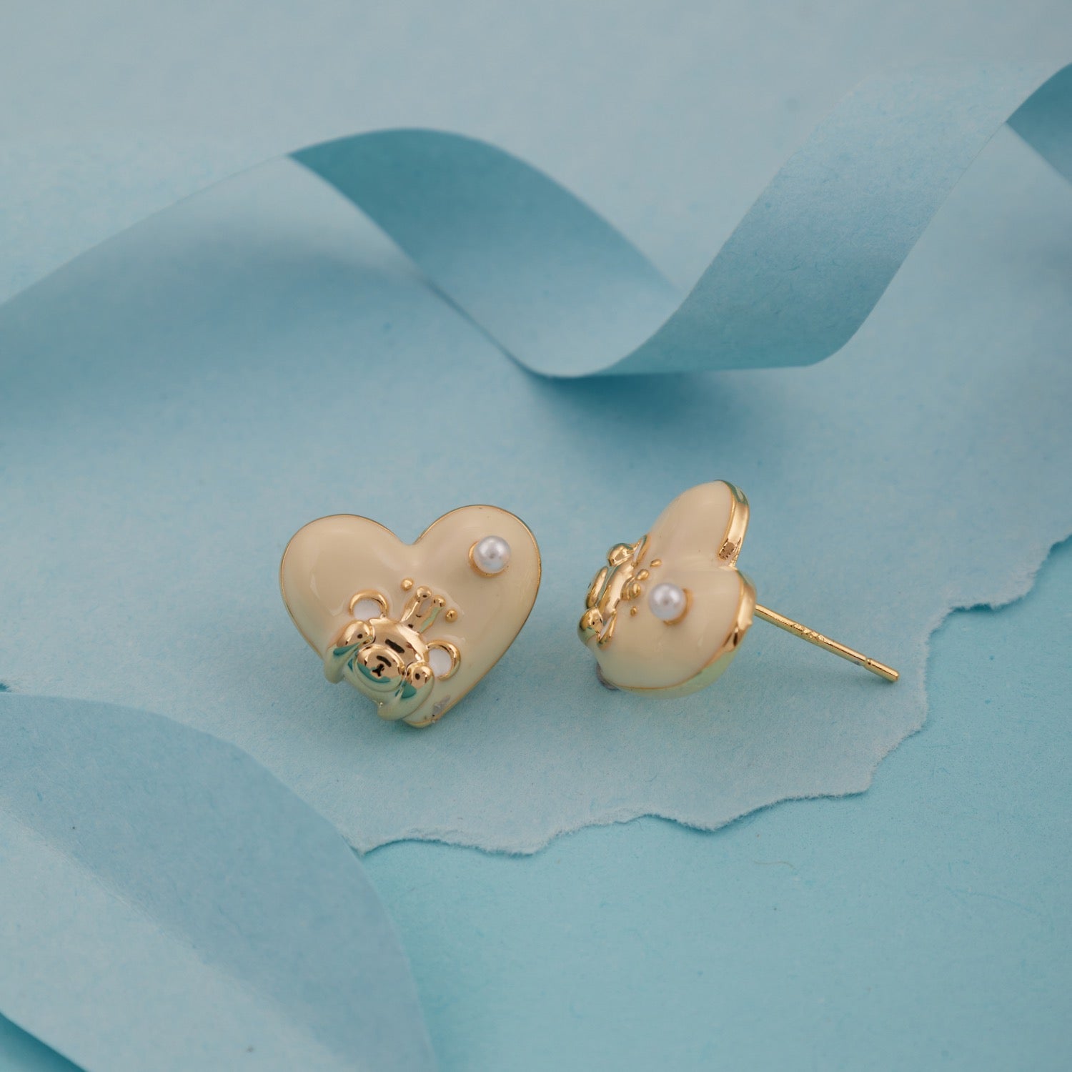 Adorable cream heart stud earrings with gold-tone teddy bear and pearl accent. Cute, lightweight, and perfect for daily wear or gifting. Ideal for teens and young girls.