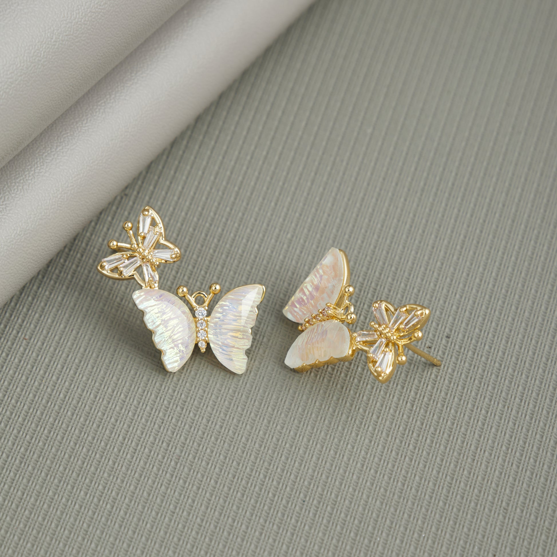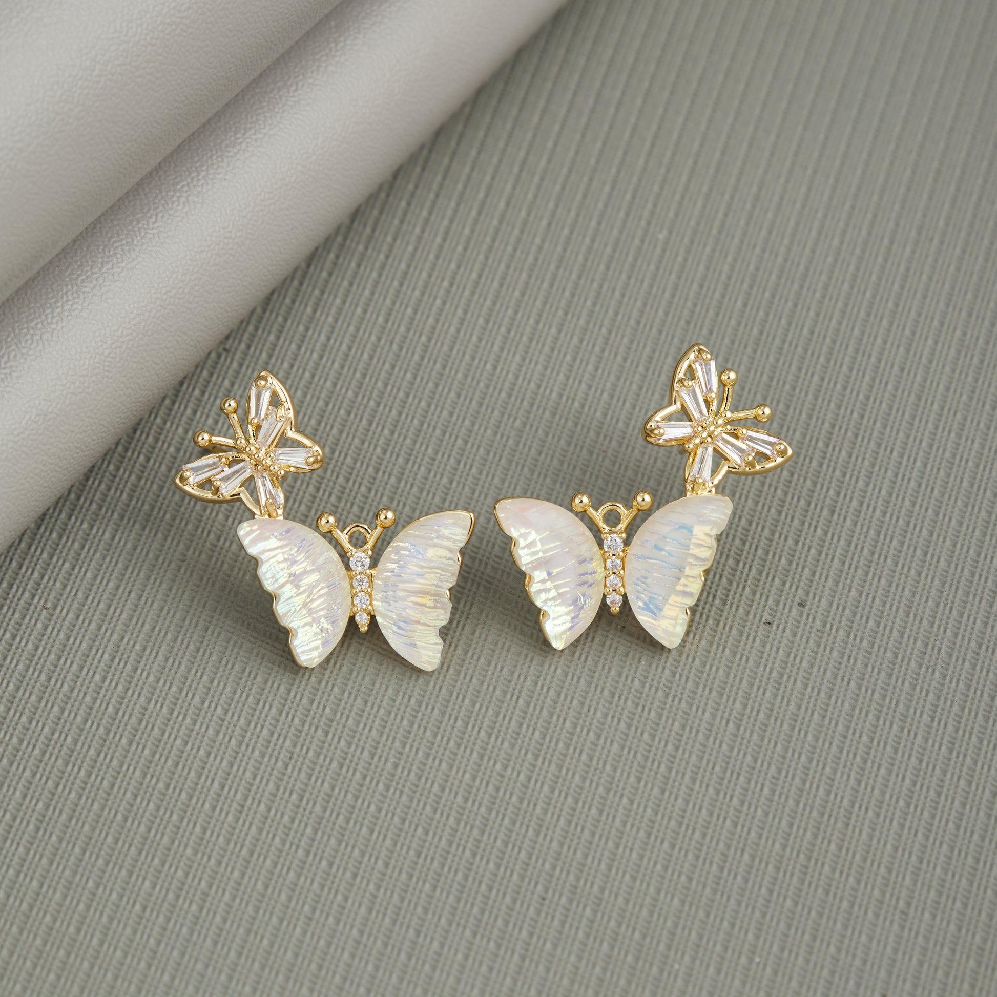Buy dreamy Gold Plated Butterfly Stud Earrings by GC Premium Jewellery. Featuring delicate, opalescent wings and a sparkling crystal-studded body, these earrings radiate grace and lightness. Crafted from a premium copper base, their elegant butterfly silhouette is perfect for adding a touch of whimsical beauty to your look.