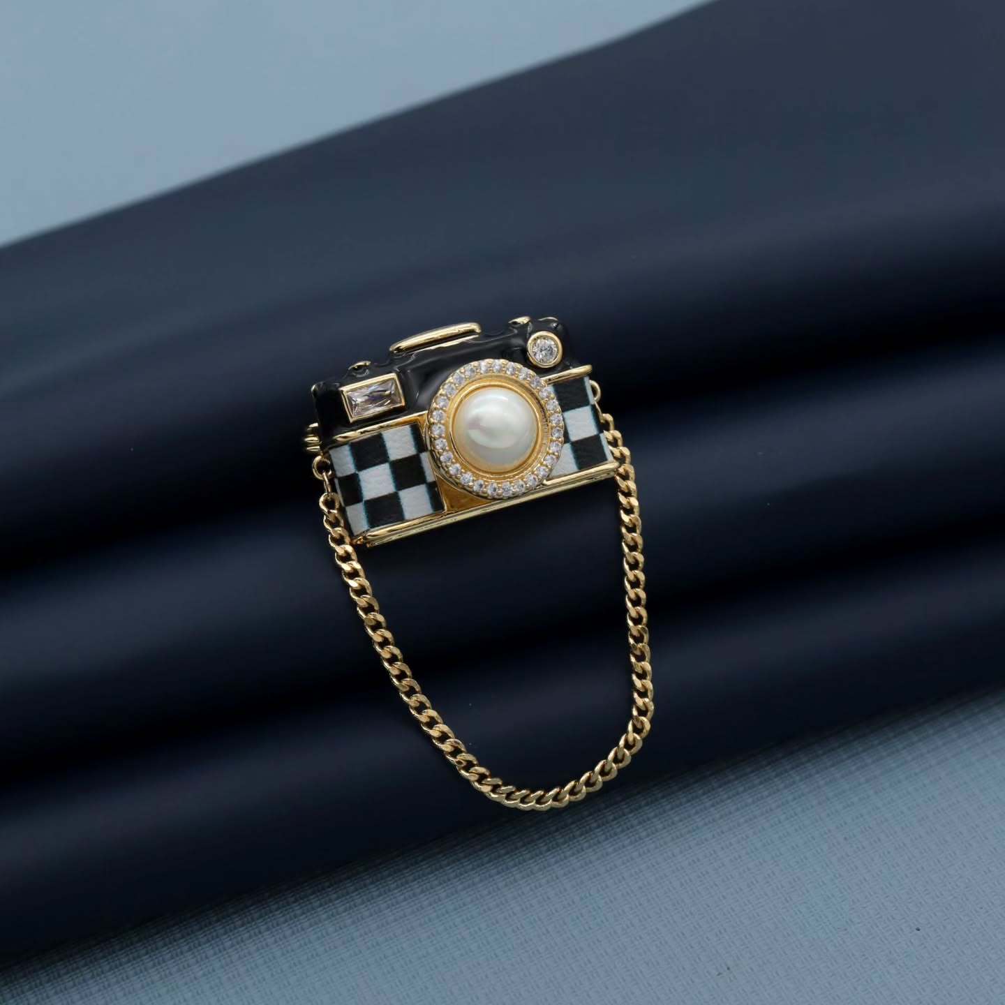 This exquisite gold and black brooch features a luminous pearl and a sleek accent chain, combining elegance with bold design. Crafted with a mix of premium materials including platinum tones, silver highlights, and gemstone detailing, this pin embodies luxury. Ideal for elevating jackets, blazers, or dresses, it’s a refined fashion accessory that adds instant sophistication to any outfit.