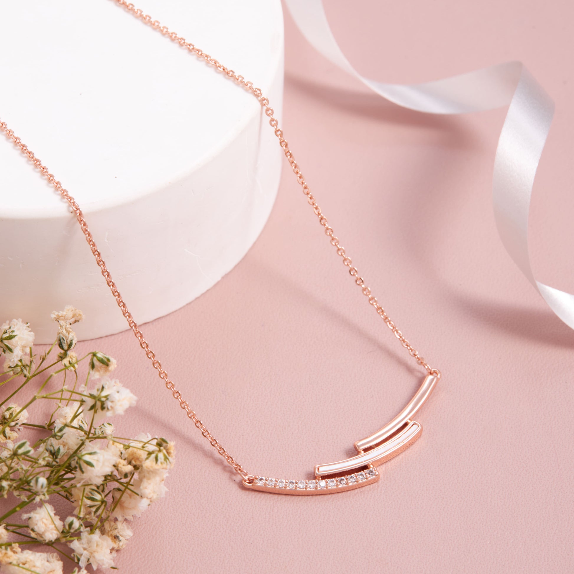 Refined simplicity meets modern elegance in this rose gold bar pendant necklace. Featuring sleek curved bars — one accented with sparkling stones — this fashion accessory brings a subtle yet sophisticated charm to any look. Ideal for indoor styling or everyday wear, it's a versatile addition to your jewelry collection.