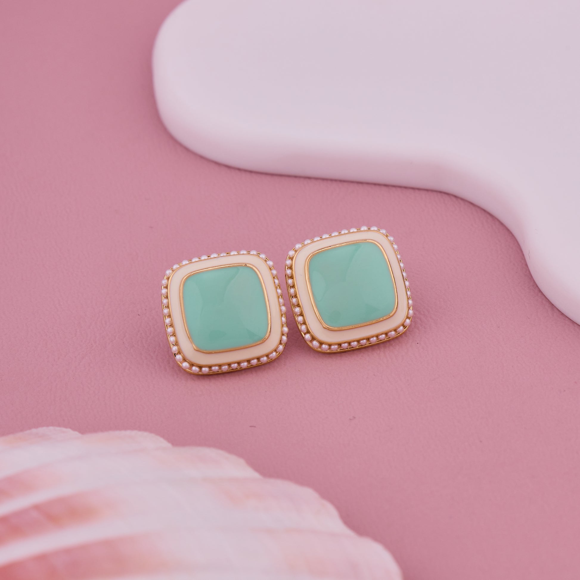 Mint Green Square Enamel Stud Earrings with Pearl Beaded Gold Border