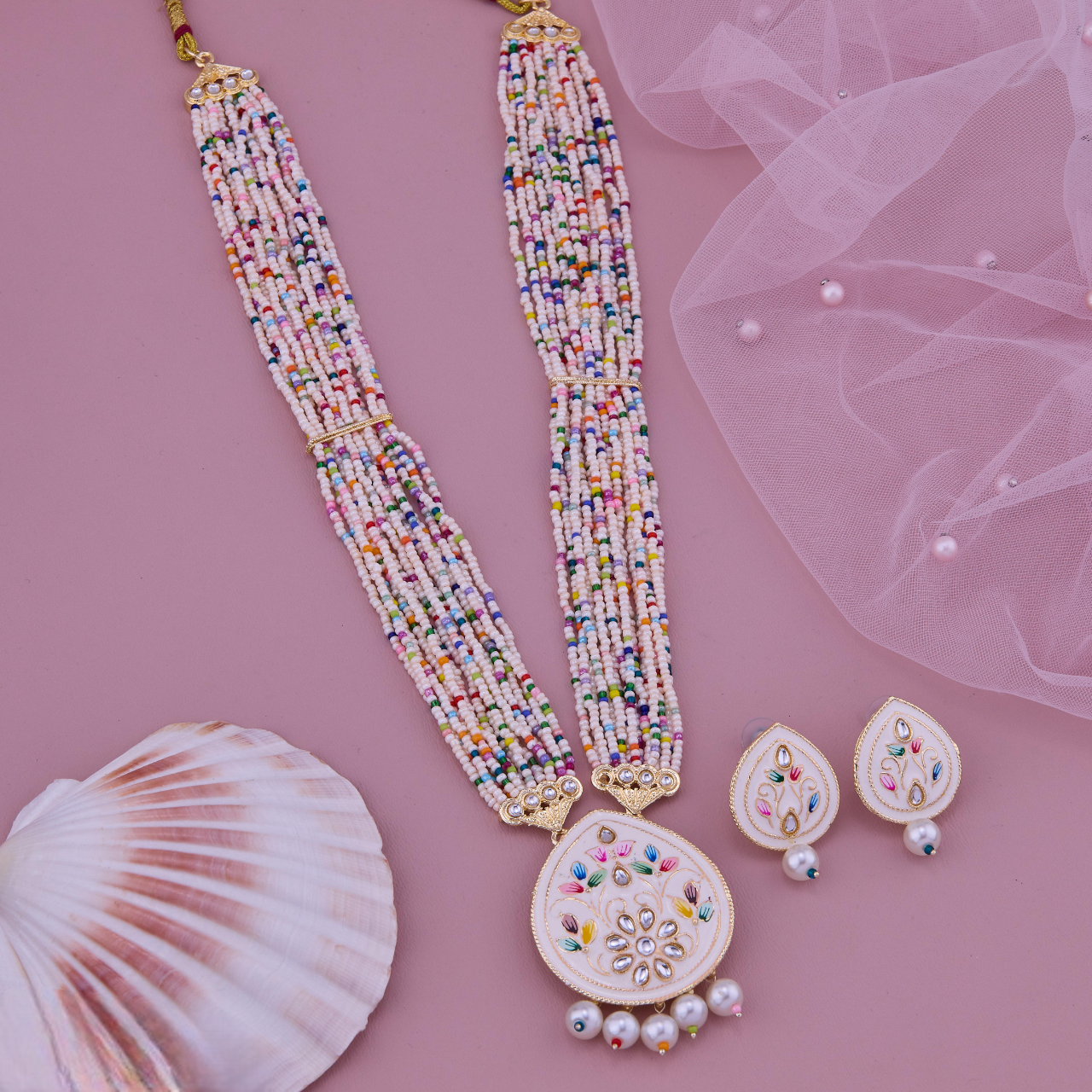 Ethnic style with this multicolor beaded necklace set, featuring a beautifully designed Meenakari pendant with pearl drops and matching earrings. Perfect for weddings, festive occasions, and parties, this handcrafted jewelry blends tradition with elegance for a timeless statement look.