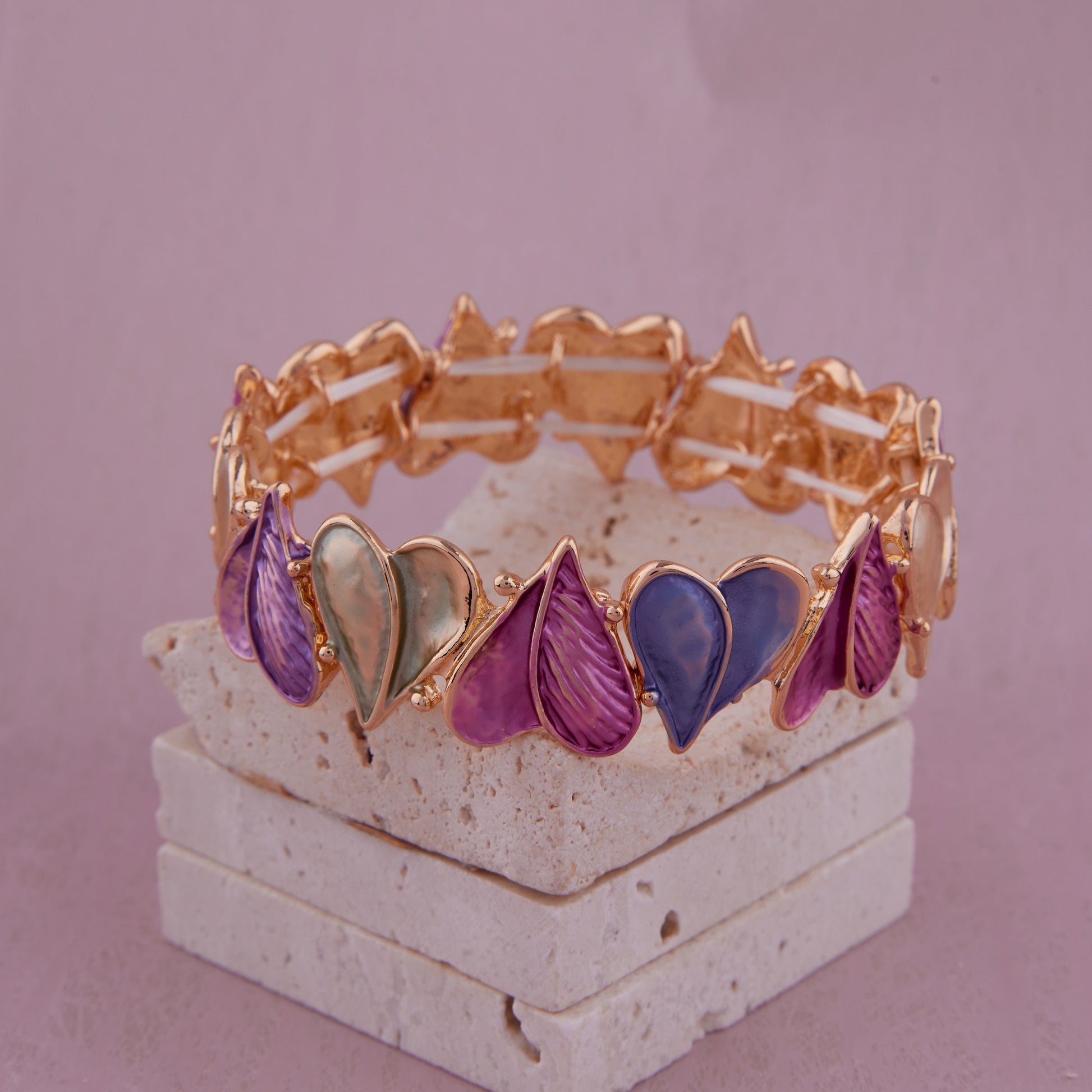 Add a pop of color and charm to your outfit with this elegant bracelet featuring heart-shaped enamel accents in vibrant hues. The gold-toned base and artistic design make it a standout piece perfect for casual or festive occasions.
