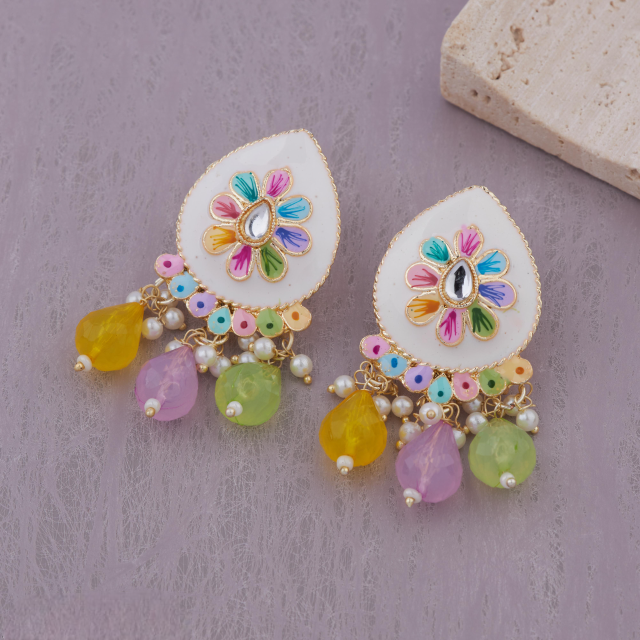 Matching Earrings: Includes a pair of designer earrings with matching motifs, completed by colorful drops and micro pearls for enhanced festive appeal.