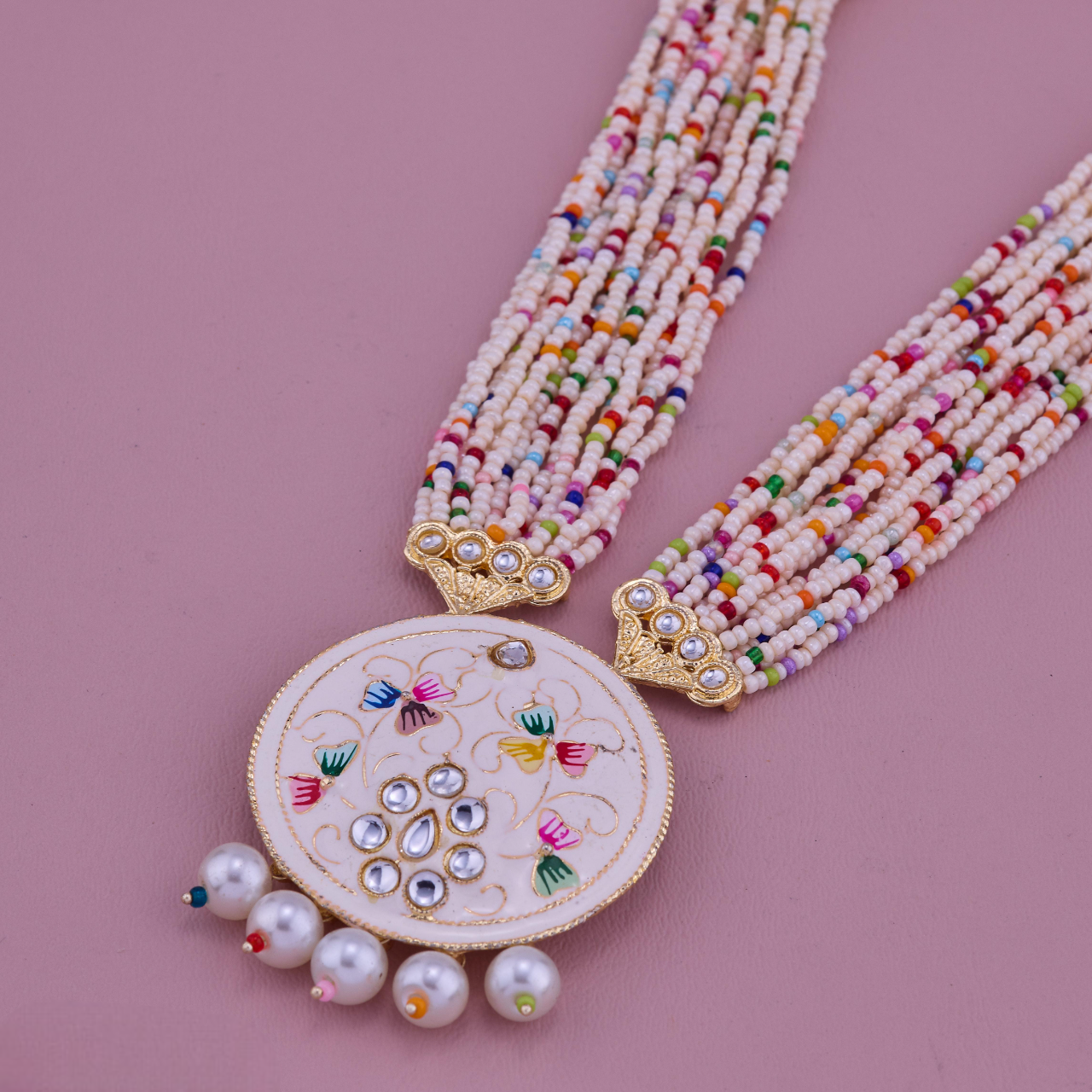 Ethnic style with this multicolor beaded necklace set, featuring a beautifully designed Meenakari pendant with pearl drops and matching earrings. Perfect for weddings, festive occasions, and parties, this handcrafted jewelry blends tradition with elegance for a timeless statement look.