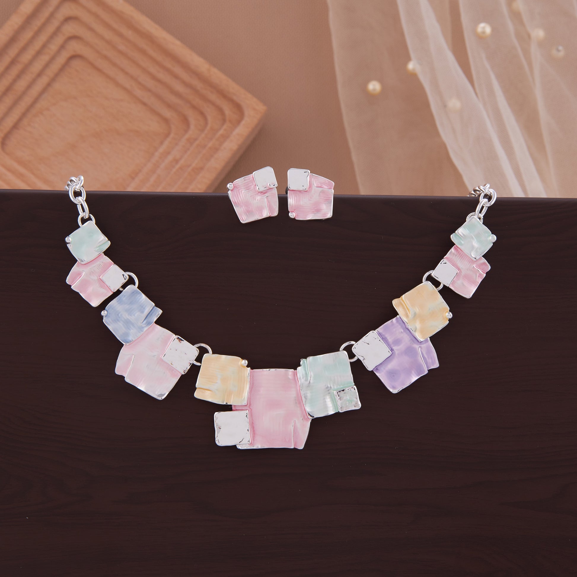 This charming jewelry set features a silver-tone chain necklace and matching earrings embellished with multicolored abstract square pieces. With soft pastel hues of pink, blue, green, yellow, and purple, this set brings a fresh, artistic flair to your look. Perfect for weddings, parties, or as a standout everyday accessory, it adds a pop of color and sophistication to any outfit.