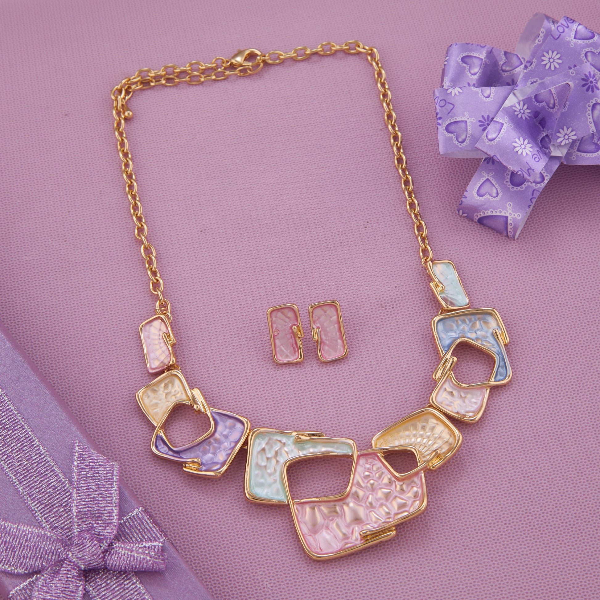 This eye-catching jewelry set features a gold-tone necklace with abstract geometric shapes filled in pastel shades of pink, blue, and lavender, paired with matching rectangular earrings. The textured enamel-like finish creates a charming, artistic vibe, perfect for celebrations, casual wear, or gifting. A unique piece that brings playful sophistication to any outfit.