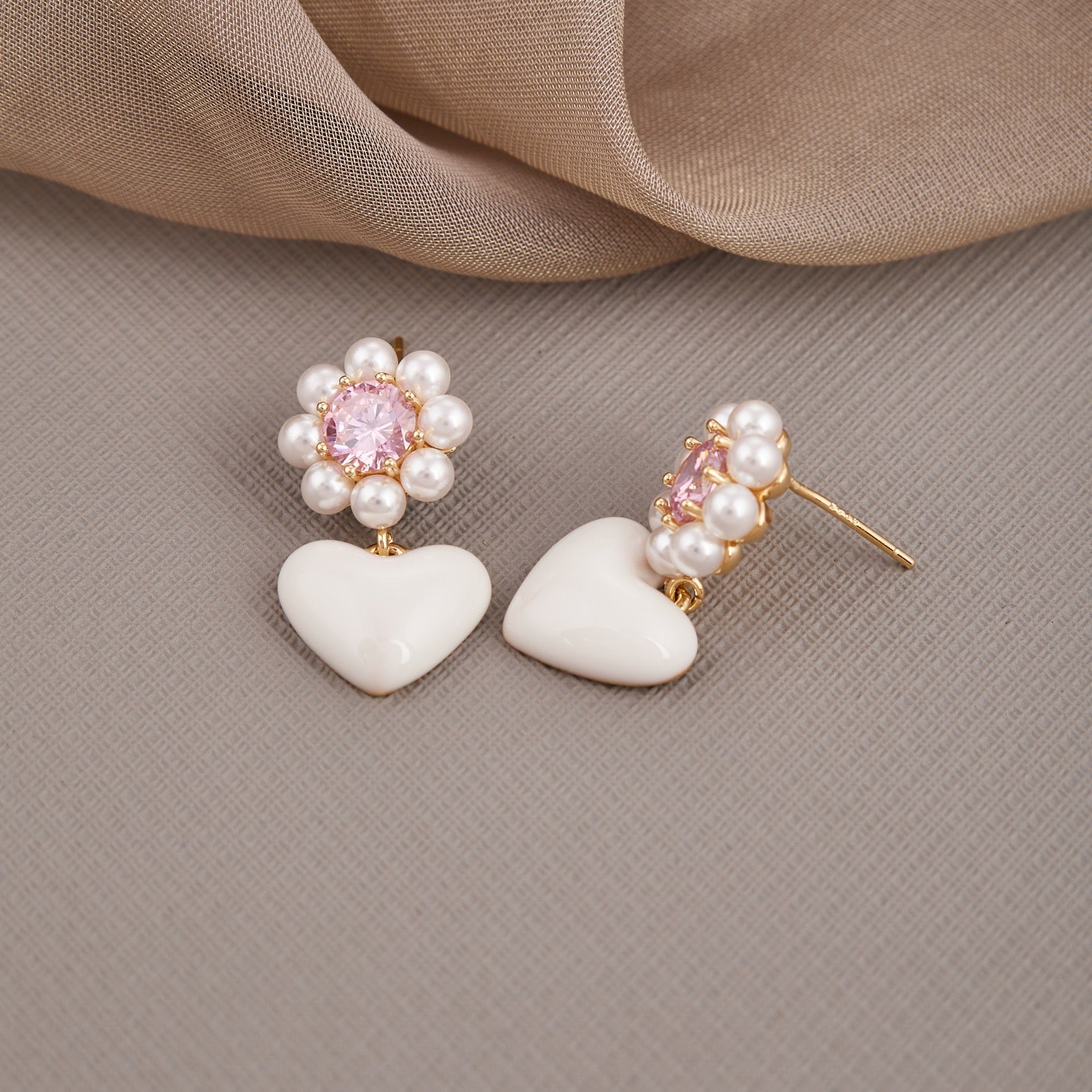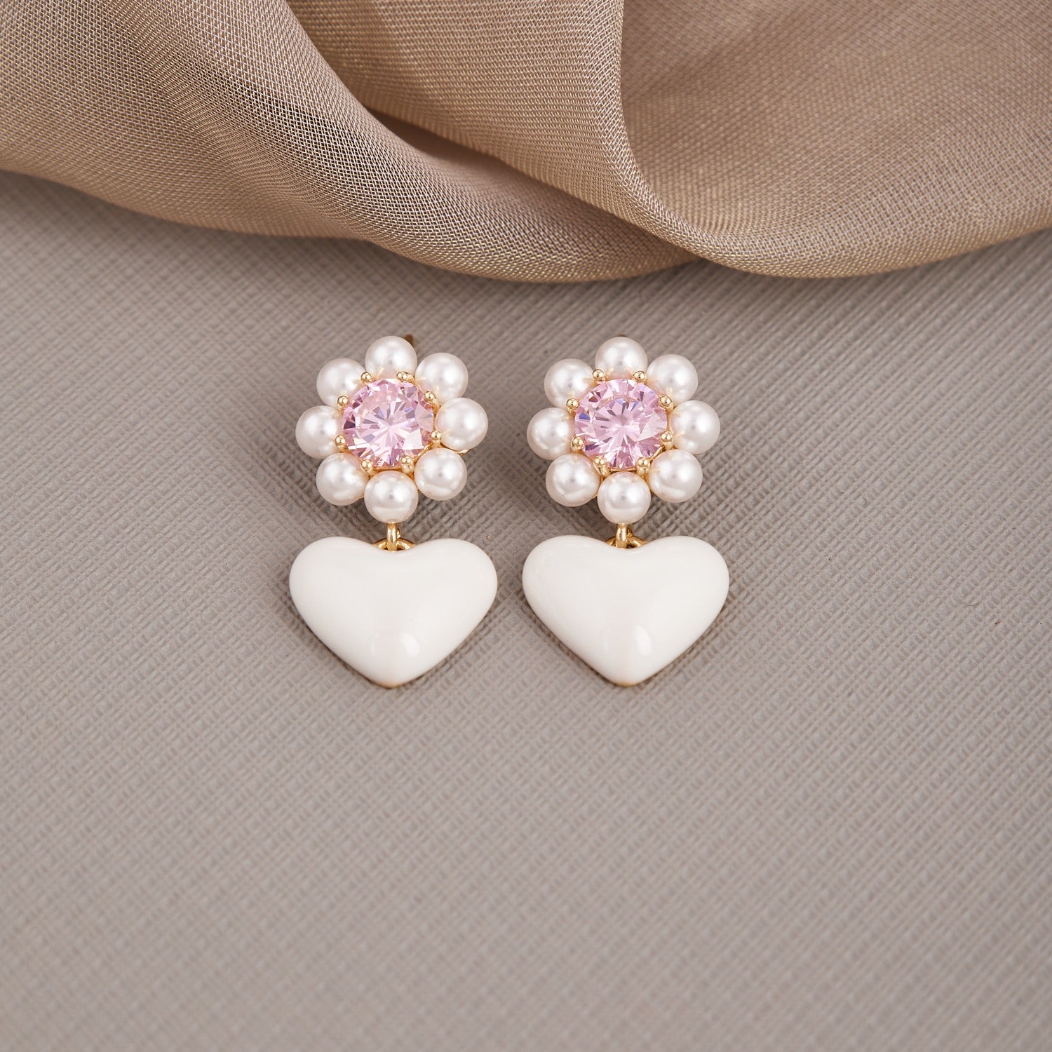 These earrings showcase a graceful pairing of lustrous pearls with a striking pink stone, creating a sophisticated and charming accessory. Designed to enhance any outfit, they blend classic elegance with a pop of color, making them a timeless addition to your jewelry collection.
